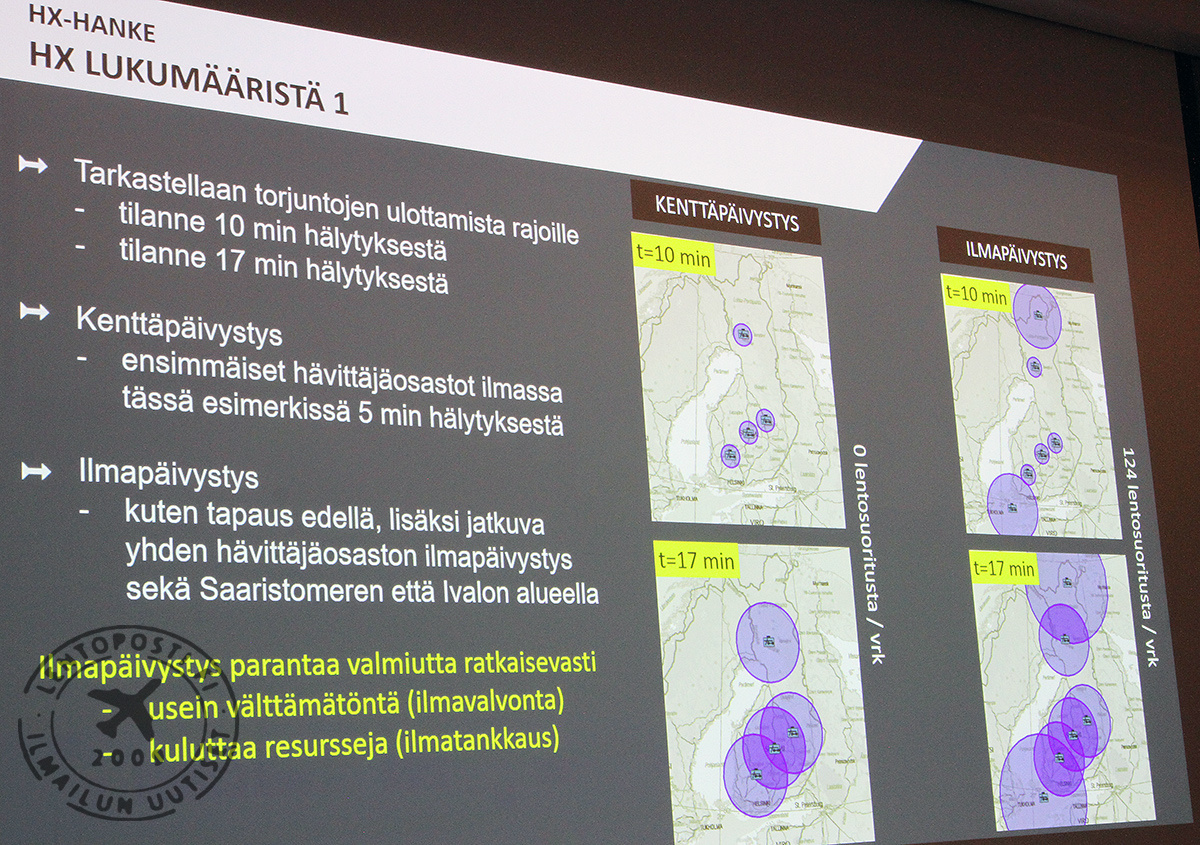 Samaan tulokseen voisi ehdokkaiden erilaisten suorituskykyjen mukaisesti päästä myös erilaisilla konemäärillä. Silti Ilmavoimien mukaan kahden toimintasuunnan operaatioihin (etelä / pohjoinen) vaaditaan vähintään 60 hävittäjää. Mihinkään tiettyyn konemäärään ei kuitenkaan silti haluta vielä hirttäytyä. Niinpä eri valmistajien nyt saapuneissa tarjouksista saattaa löytyä varsin erilaisia näkemyksiä siitä, millaisilla ilma-alus ja asejärjestelmä -yhdistelmillä Suomen vaatima suorituskyky saavutetaan. Saab on jo kertonut tarjoavansa 52 yksipaikkaista JAS 39 E Gripen ja 12 kaksipaikkasta JAS 39 F -konetta. Joka tapauksena HX-hankkeessa on perimmäisenä tavoitteena rakentaa sellainen viholliselle tappioita tuottava ilmapuolustuskyky, joka toimii jo rauhan aikana aitona pidäkkeenä maahamme hyökkäämiselle. Ei kuitenkaan riitä että hankittava konetyyppi kykenee tuottamaan vastustajalle tappioita. Hävittäjän on myös kyettävä palaamaan tukikohtaan uudelleen tankattavaksi ja aseistettavaksi kalliisti koulutettu ohjaaja mukanaan. Oli tyyppi mikä tahansa, sotilaskoneista on aina eri tason huolloissa 20-30 prosenttia. Jos hankitaan esimerkiksi julkisuudessa esitetyt vain 47 konetta, päivittäisessä käytössä olisi silloin noin 30 hävittäjää (toki karkea arvio, konetyyppien käytettävyysprosentit vaihtelevat). Yllä ja alla olevissa kuvissa on Puolustusministeriön tiedotustilaisuudessa 29. tammikuuta esitettyjä havainnekuvia eri konemäärien käyttömahdollisuuksista. Maanpuolustuksen kannalta enemmän on toki aina parempi. Onpa puolustusministeri Jussi Niinistö väläyttänyt optimimääräksi jopa 100 hävittäjää.