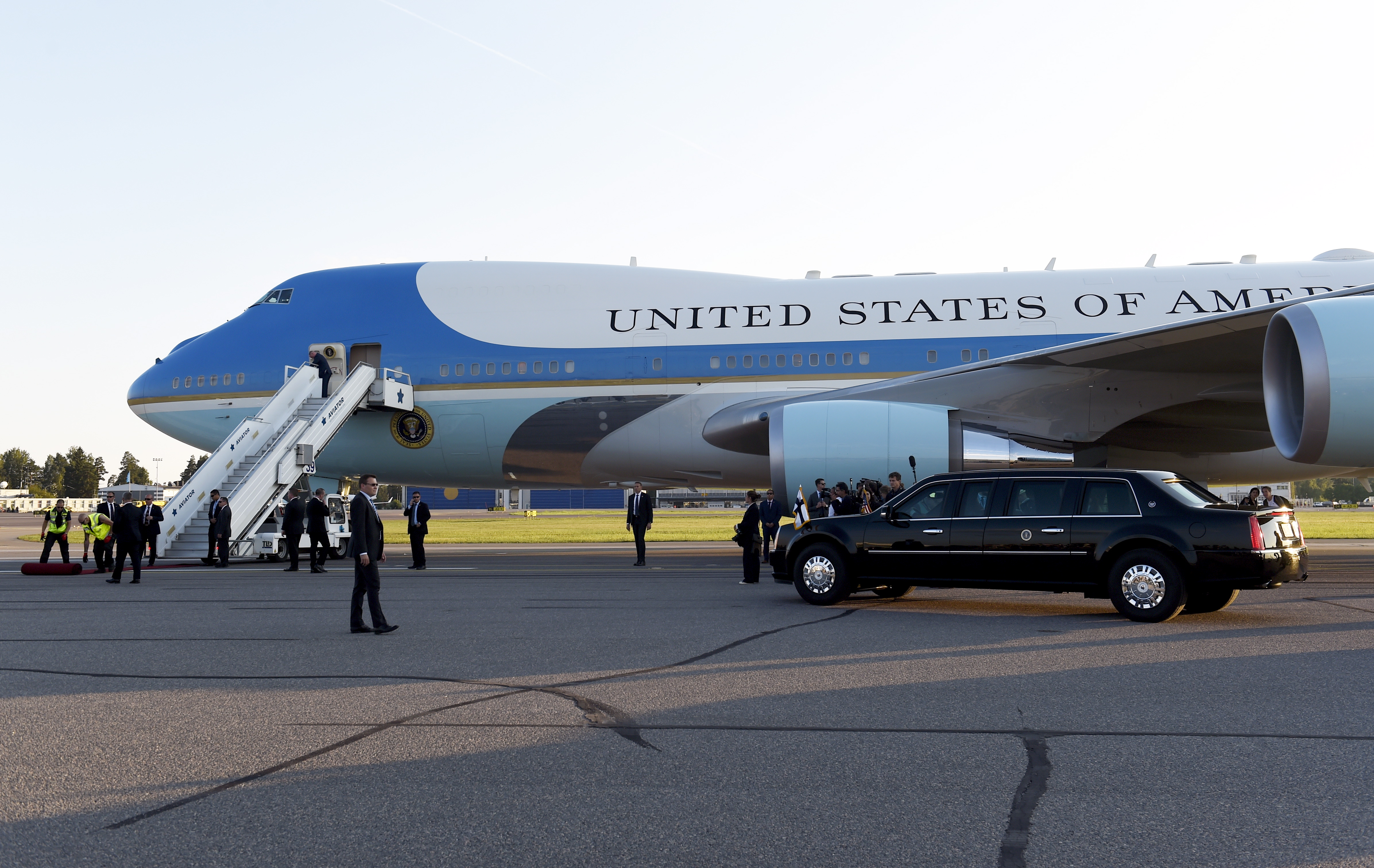 Koneen matkustajakannen etuovelle oli ajettu kenttähuolintayhtiö Aviatorin porrasajoneuvo. Presidentin muu seurue ja mukana matkustavat median edustajat poistuivat rahtikannen takaoven koneen kautta omien portaiden kautta. Kiitotielle levitetyllä punaisella matolla tapahtuneiden pikaisten tervehdysten jälkeen presidentti nousi The Beast -nimellä tunnettuun panssaroituun Cadillac-limusiiniinsa (kuvassa alla) ja aloitti pitkässä mustien autojen saattueessa matkan hotelli Kalastajatorpalle.
