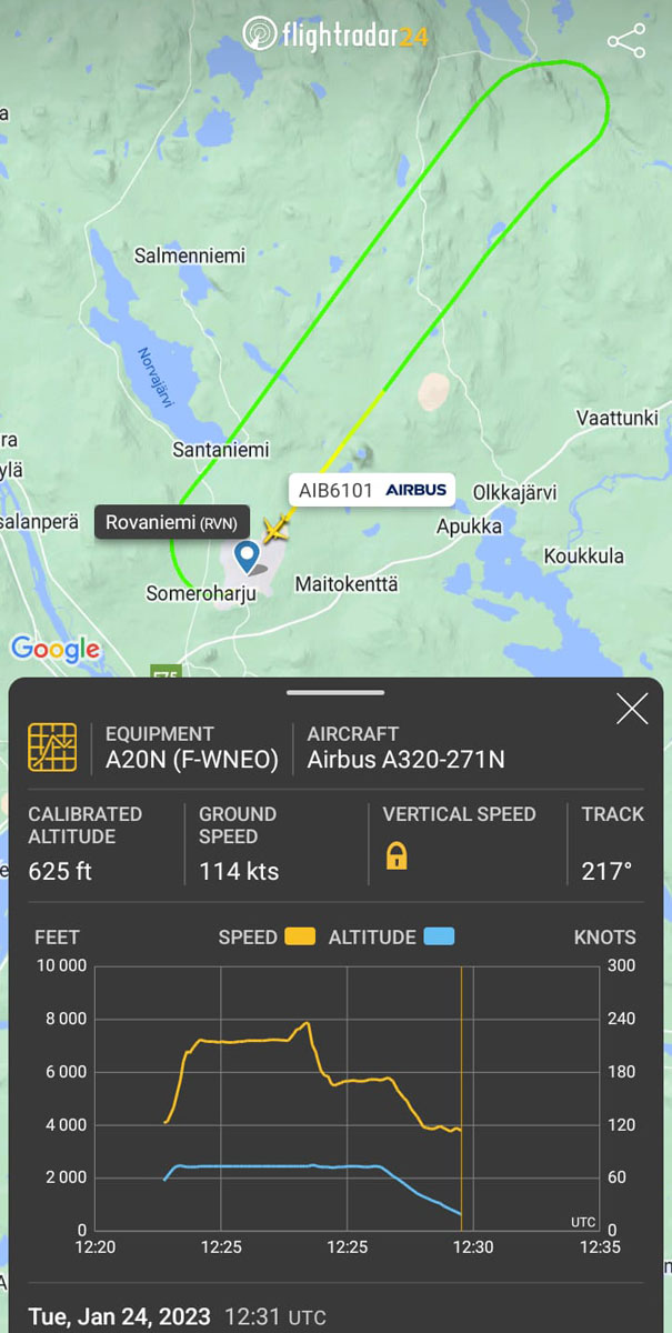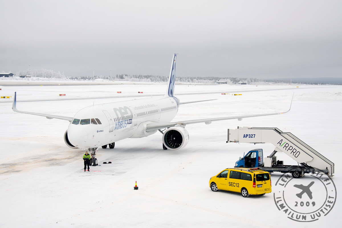 Airbus A320neo-koelentokone (MSN6101, F-WNEO) saapui tiistaina 24. tammikuuta Rovaniemelle suorittamaan talvioperointiin liittyviä koelentoja. Kahden päivän aikana koelentokone lensi Rovaniemellä ainakin viisi lyhyttä koelentoa ennen kuin se palasi takaisin Toulouseen 25. tammikuuta. Kyseisessä koneyksilössä on Pratt & Whitney PurePower PW1100G-JM -moottorit.