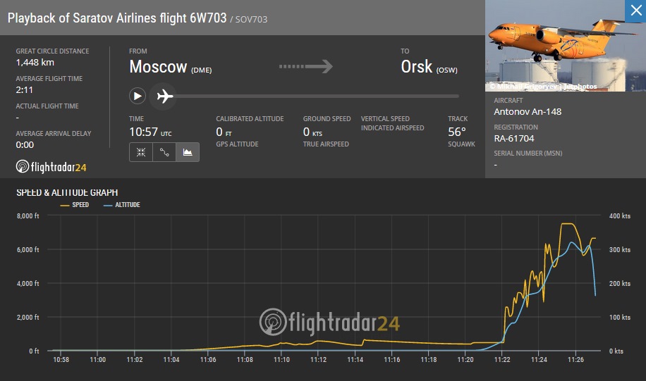 Grafiikka perustuu koneen lennonjohdoille lähettämään ADS-B-dataan (Automatic Dependent Surveillance – Broadcast), jonka perusteella FlightRadar24 seuraa lentoliikennettä ja esittää sen nettipalvelussaan. RA-61704 syöksyi maahan lähellä Argunovin kylää. Paikalta välitettyjen videoiden perusteella Antonov on hajonnut pieniksi kappaleiksi. Osat ovat levinneet laajalle, mutta tulipaloa ei syttynyt. Venäjän hätätilanneministeriön mukaan onnettomuuspaikalla on yli 400 pelastajaa sekä avustajia 70 yksiköstä. Etsintätoimia on vaikeuttanut alueen lumipeite. Saratov Airlinesin kotipaikka on Saratov. Yhtiö on perustettu jo 1931 ja toimi osana Aeroflotia Neuvostoliiton aikana. Saratovilla on laivastossaan viisi Jakovlev Jak-42, viisi An-148 ja kaksi Embraer E195 -konetta. Yhtiö on lentänyt Suomeenkin (otsikkokuvassa Antonov Rovaniemellä tammikuussa 2018).