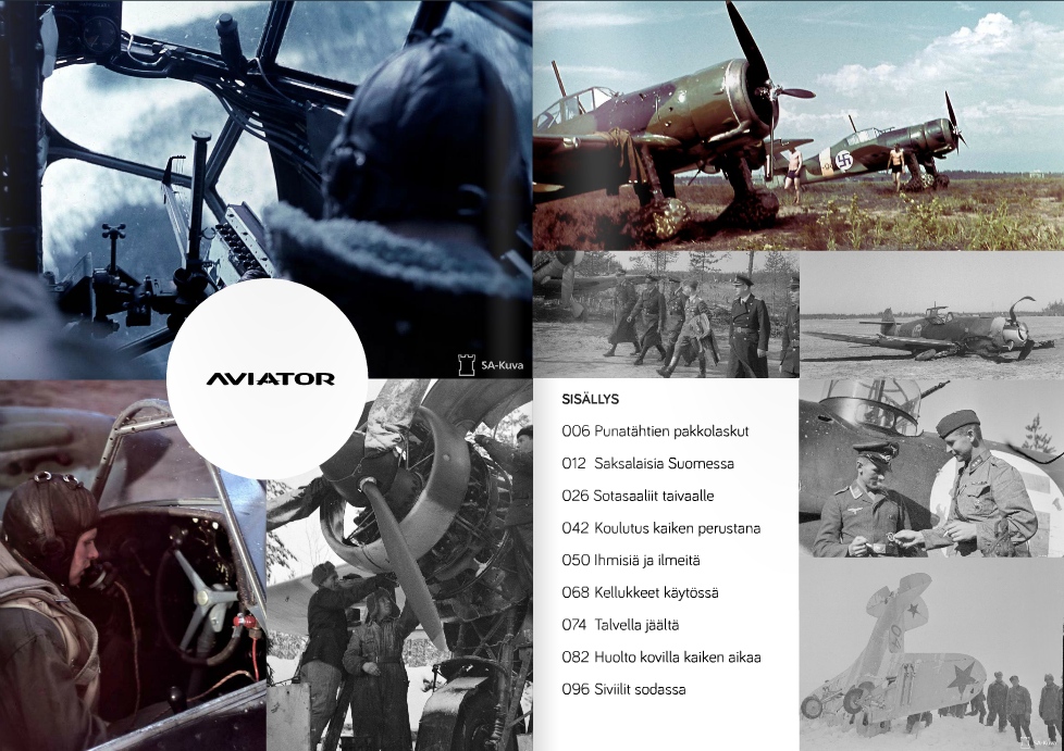 Ainoa mikä hieman ihmetyttää, on saksalaisen Stukan nostaminen kanteen. Totta on, että Luftwaffen osasto Kuhlmey oli osana Tali-Ihantalan ihmettä, mutta toki myös suomalaisten koneiden komeita kuvia olisi löytynyt SA-kuva -sivuilta. Aviator-lehden näytenumero julkaistiin 29. marraskuuta 2012 ja ensimmäinen varsinainen verkkolehti ilmestyi tammikuussa 2013. Toistaiseksi viimeiseksi varsinaiseksi numeroksi vaikuttaa jääneen koostenumero 8/2013. Ilmeisesti ilmailusta kiinnostuneet lukijat eivät olleet vielä valmiita maksulliselle nettilehdelle. ++ Lentoposti.fi valitsi: SA-kuva.fi julkaisi 800 sodan ajan värikuvaa - tässä parhaat 40 Aviator-lehti: SA-kuvat kertovat - Suomi Ilmasodassa Lue aiempia Lentoposti.fi -juttuja aiheesta: