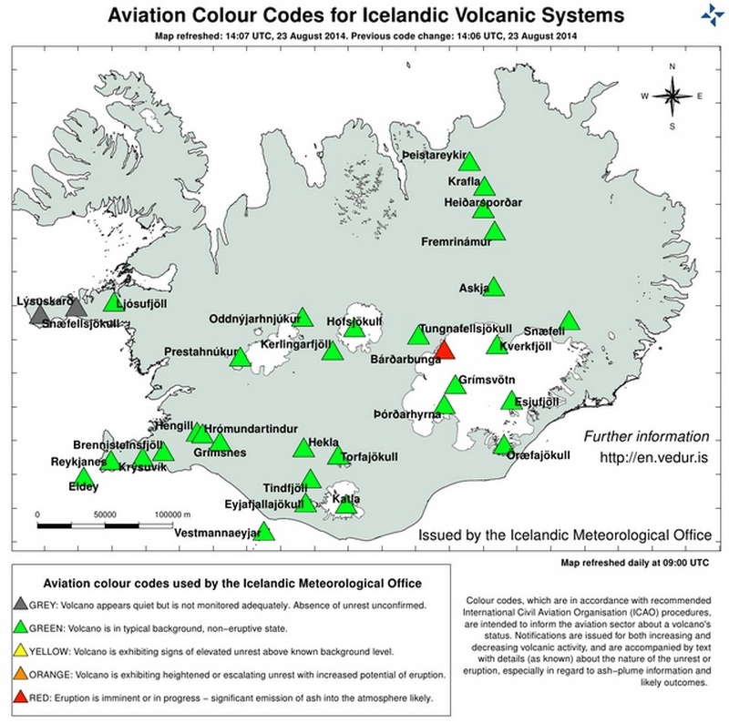 Tulivuoren purkaus on toistaiseksi pysynyt Dyngjujökull-jäätikön alla ja sulan magman arvioidaan olevan kosketuksessa jäätikköön. Seismisten tietojen mukaan purkaus olisi alkanut paikallista aikaa kello 14.00. Toistaiseksi pinnalla ei näy merkkejä purkauksesta sulan veden muodossa. Ilmassa ei myöskään ole tuhkapilveä. Islannin rannikkovartiosto lensi iltapäivällä tarkkailulennon alueen yli ja mitään muutoksia jäätikön pinnalla ei havaittu. Arvioiden mukaan alueella on 150-400 metrin paksuinen jääpeite. Islanti on kuitenkin rajoittanut lentoliikennettä vuoren läheisyydessä. Lentokenttiä ei ole suljettu. Purkauksen mahdollisesti saavuttaessa jään pinnan ja tuhkapilven levitessä Lontoon VAAC (Volcanic Ash Advisory Center) julkaisee ennustekartan tuhkapilven liikkeistä lentoliikenteen tarpeisiin. Mahdollinen tuhkapilvi ei enää nykyisin pysäytä koko lentoliikennettä. Kehitetyt menetelmät mahdollistavat operaatiot myös tuhkapilven alueella pitoisuuksista riippuen. Purkauksella ei ole vielä toistaiseksi vaikutusta Suomeen. Finnairin lennoista Islannin ilmatilassa operoivat lennot New Yorkiin ja Torontoon. Nyt asetettu lentokieltoalue ei kuitenkaan aiheuta viiveitä kyseisille lennoille. Suomen liikenteen turvallisuusvirasto Trafi seuraa tilannetta ja tiedottaa asiasta tarvittaessa. Tässä linkissä on Bardarbungan aluetta näyttävä web-kamera, mutta se päivittyy hitaasti suuren kuormituksen vuoksi: www.livefromiceland.is Lue myös:
