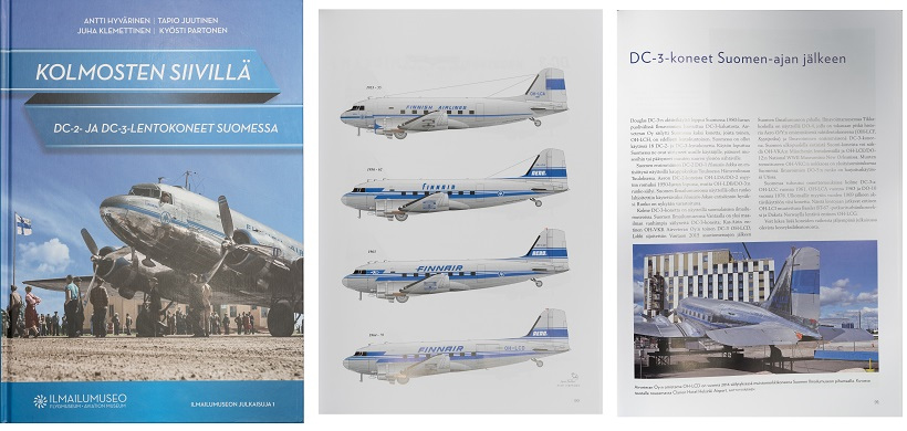 Kolmosen siivillä – DC-2- ja DC-3-lentokoneet Suomessa -teoksen takana ovat Antti Hyvärinen, Tapio Juutinen, Juha Klemettinen ja Kyösti Partonen. Kirja sisältää 272 sivua ja on myynnissä Ilmailumuseon museokaupassa, verkkokaupassa (webshop.trafiikki.fi) sekä hyvin varustetuissa kirjakaupoissa. Suomen Ilmailubibliografiayhdistys myöntää vuosittain Vuoden Ilmailukirja -kunniamaininnan sille edellisvuonna ilmestyneelle teokselle, jonka yhdistyksen jäsenistö on äänestänyt parhaaksi vuoden aikana ilmestyneeksi ilmailuaiheiseksi teokseksi. Tänä vuonna äänestys oli kahden teoksen välinen tiukka kilpa. Toiseksi ylsi Mikko Ylikankaan teos Mainio pikku sota – Brittilentäjät Suomessa vuonna 1919. Kunniamaininta myönnettiin Ilmailumuseolla järjestetyssä Studia Aviation: Ilmailukirjallisuus -tapahtuman yhteydessä. Ilmailubibliografiayhdistyksen ja museon yhteistyössä järjestämässä tapahtumassa luotiin perusteellinen katsaus ilmailukirjallisuuden ja -tutkimuksen menneisyyteen, nykytilaan ja tulevaisuuteen alustusten ja paneelikeskustelujen kautta. Äänessä olivat paitsi lajityyppiä harrastavat bibliofiilit, myös kirjailijat ja tutkijat. Ilmailumuseo esitteli tilaisuudessa omaa rooliaan kirjallisuuden tallentajana, tutkijana, julkaisijana ja julkituojana. Lue myös: