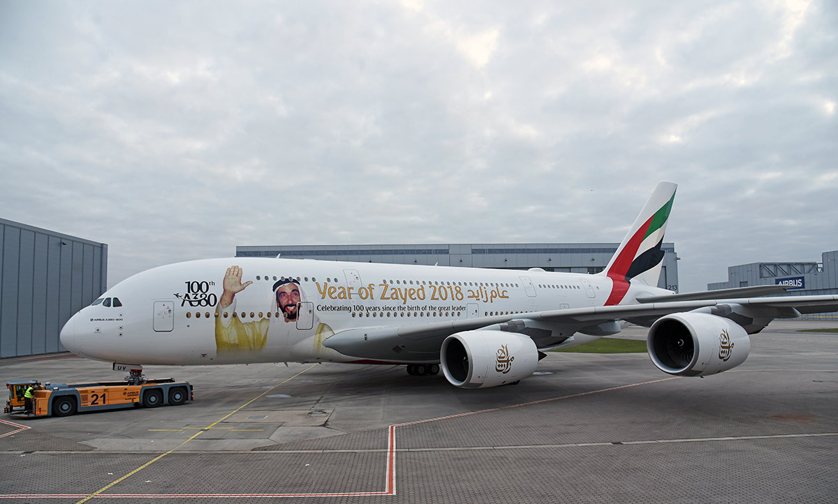 Emiratesin A380-koneilla on vuodesta 2008 lähtien matkustanut jo yli 86,6 miljoonaa ihmistä. Sadan koneen laivastolla on lennetty yli 1,3 miljardia kilometriä, joka tarkoittaa yli 95 000 kertaa maapallon ympäri matkustamista. Uusin kone on esillä juuri alkaneessa Dubai Airshow -tapahtumassa, jonka jälkeen se otetaan normaaliin lentoyhtiökäyttöön. Erikoismaalatut A380- ja 777-koneet tulevat lentämään kaikkiin Emiratesin 156 kohteeseen.