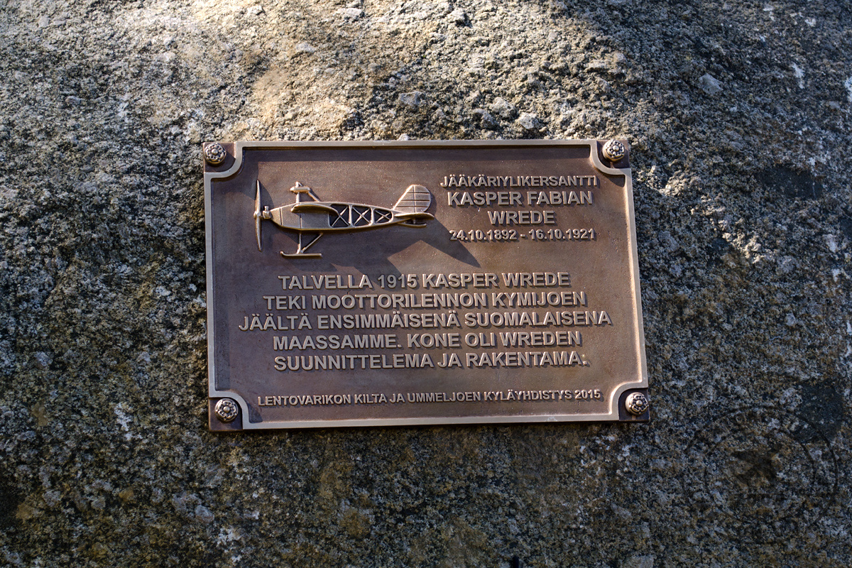 Kasper Wreden keväällä 1915 tekemää lentosuoritusta kunnioitettiin Myllykosken vesistökeskuksessa Kymijoen rannalla. Wrede lensi noin 500 metrin matkan omatekoisella koneellaan. Kyseessä on Suomen ensimmäinen moottoroitu lento.