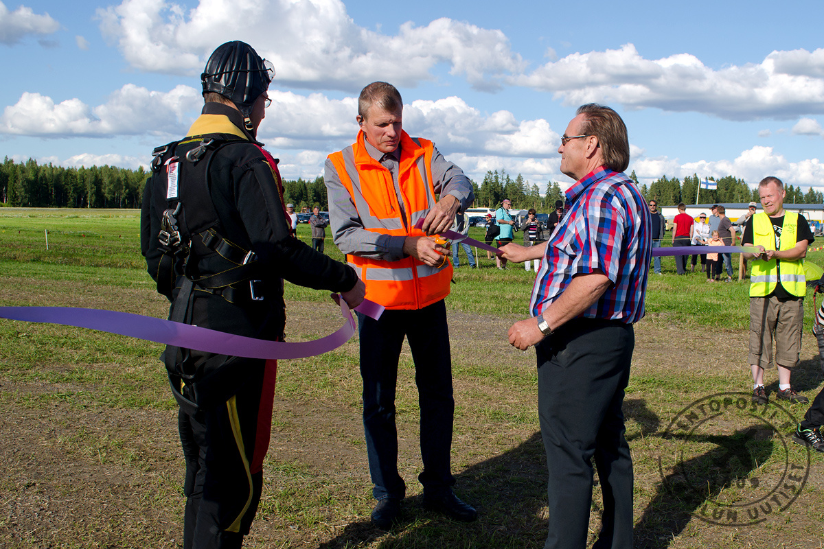 Virallisen kiitotien avausnauhan leikkasivat yhdessä lentopaikan omistaja Tuomo Salonen sekä Ummeljoen kyläpäällikkö Jukka Naukkarinen.