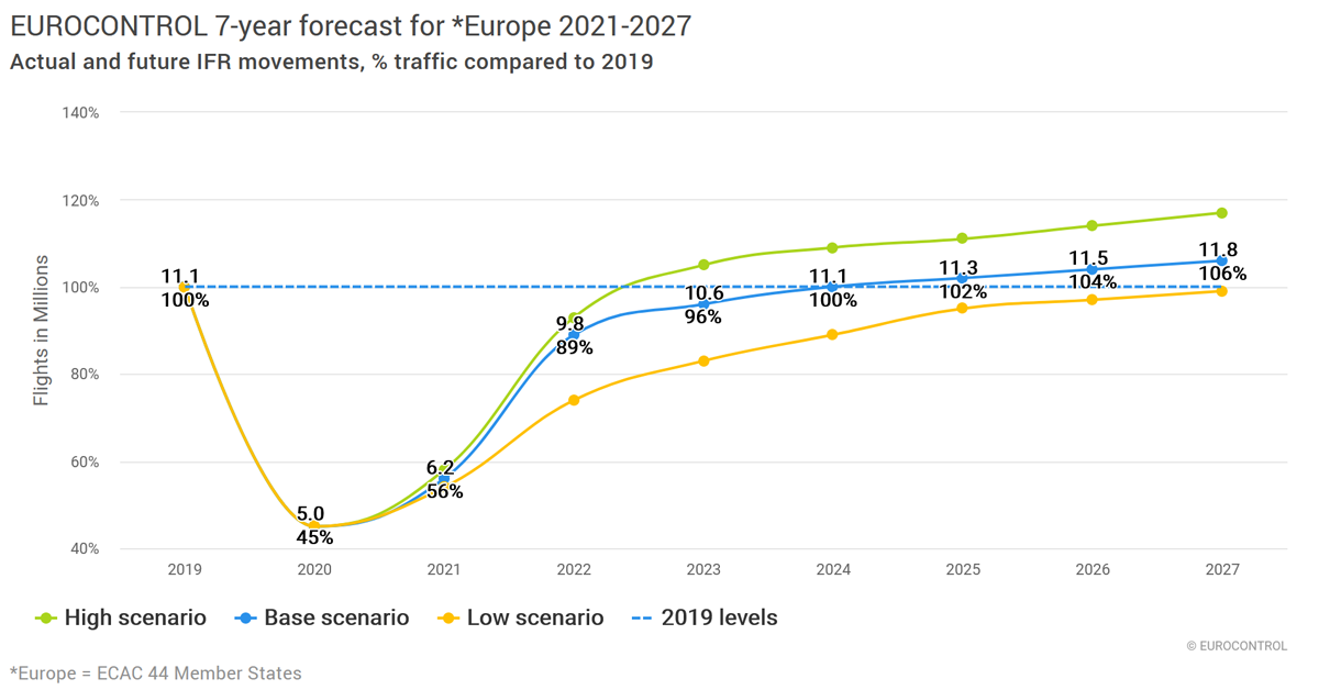 "Olemme optimistisia liikenteen palautumisesta vuoden 2019 tasolle aiemmin kuin odotettiin. Perusennustemalli osoittaa 9,8 miljoonaa lentoa vuodelle 2022, joka on vain 11 prosenttia vähemmän kuin vuonna 2019. Meidän pitää kuitenkin olla tietoisia, että on olemassa merkittäviä riskejä, jotka voivat vaikuttaa lentoliikenteen palautumiseen", jatkoi Brennan.