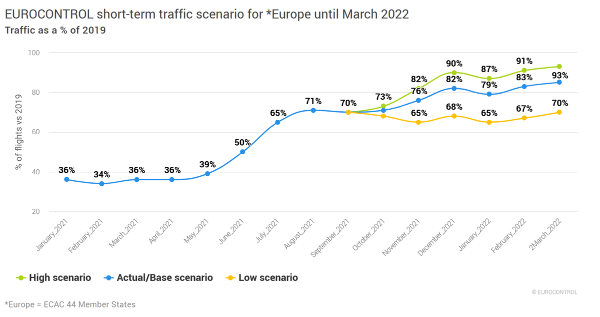Perusennustemalli on hyvin samankaltainen, mutta liikennevirtojen odotetaan palautuvan Euroopassa hieman hitaammin. Pääsyynä olisi yhteisten koordinoitujen toimien puute tai niiden epäonnistuminen. Liikematkustus palautuisi perusmallin mukaan pandemiaa edeltävälle tasolla vuonna 2023. Perusennustemallissa transatlanttinen matkustajaliikenne elpyisi marraskuussa 2021, Lähi-itä vuoden 2022 ensimmäisen neljänneksen aikana, Aasian ja Tyynenmeren sekä Intian osalta elpyminen tapahtuisi vuoden 2022 kolmannella neljänneksellä ja Australia vasta loppuvuodesta 2022. Hitaimman palautumisen ennustemalli huomioi rokotekattavuuden kasvun hitauden, uusien rokotteiden kehittämistarpeen virusmuunnoksia vastaan, mahdolliset uudet matkustusrajoitukset sekä energian hinnan nousun.