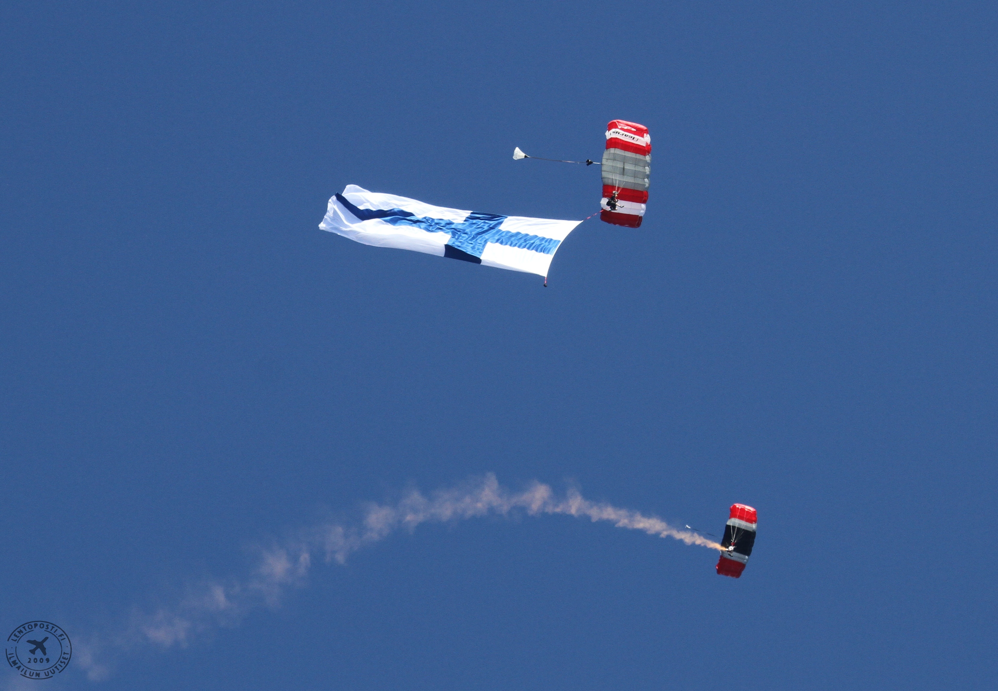 Sen jälkeen sinisellä taivaalla nähtiin jättimäinen Suomen lippu, jota veti perässään tandem-hyppyvarjolla leijaillut Simo Moilanen. Lipun kulkua taivaalla saattoi laskuvarjon varassa Janne Saikko, joka oli varustautunut suoritukseen merkkisavulla.