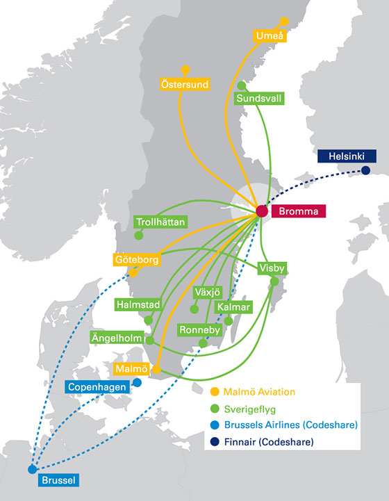 BRA keskittyy Ruotsin sisäisiin lentoihin, ja sen kotikenttänä on Tukholman Bromma. BRA:n muut kohteet Ruotsissa ovat Uumaja, Östersund, Sundsvall, Visby, Trollhättan, Göteborg, Växjö, Kalmar, Ronneby, Halmstad, Ängelholm ja Malmö. Bromman kautta BRA:n verkosto yhdistyy Finnairin lentoihin. Finnairin lisäksi BRA tekee codeshare yhteistyötä Brussels Airlinesin kanssa lennoille Brommasta, Göteborgista ja Kööpenhaminasta Brysseliin.