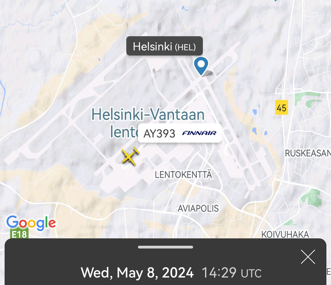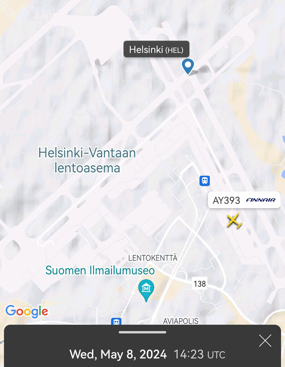 Koneenvaihdon jälkeen lento AY393 pääsi matkaan hieman alle kolme tuntia myöhässä kello 20.02. Finnair perui illalta lennon Brommaan, jonka lähtöaika olisi ollut 20.25.