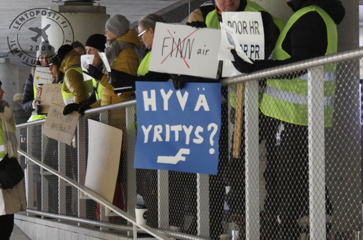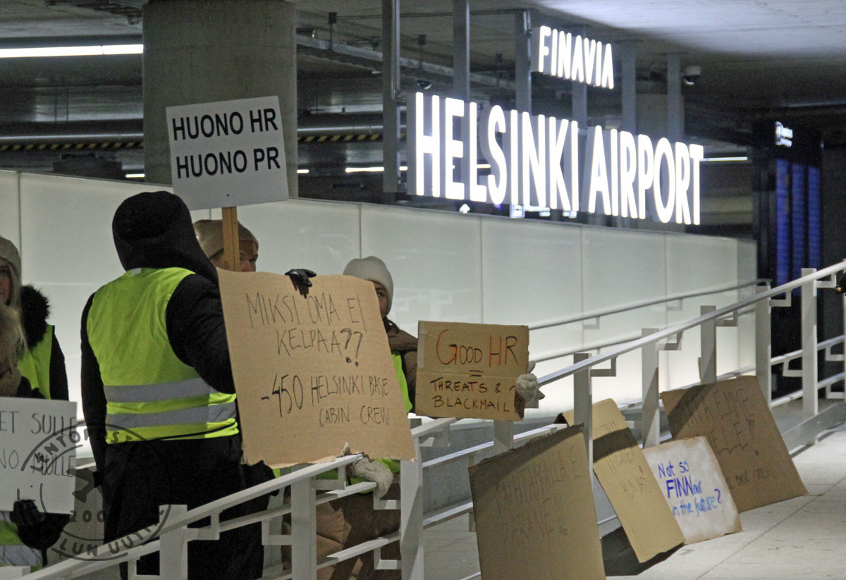 Helsinki-Vantaan lentoasemalla on käynnissä Finnairin työntekijöiden mielenilmaus, johon osallistuu poliisin arvion mukaan alkuillasta noin 100 ihmistä. He vastustavat Finnairin henkilöstöpolitiikkaa, huonoa johtamista ja työntekijöiden irtisanomisilla uhkailua. Finnairin matkustamopalvelu marssi ulos Helsinki-Vantaalla maanantaina 20. marraskuuta kello 15.00.