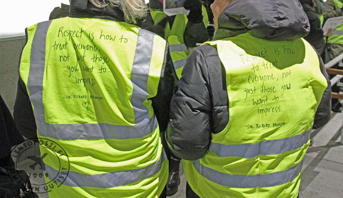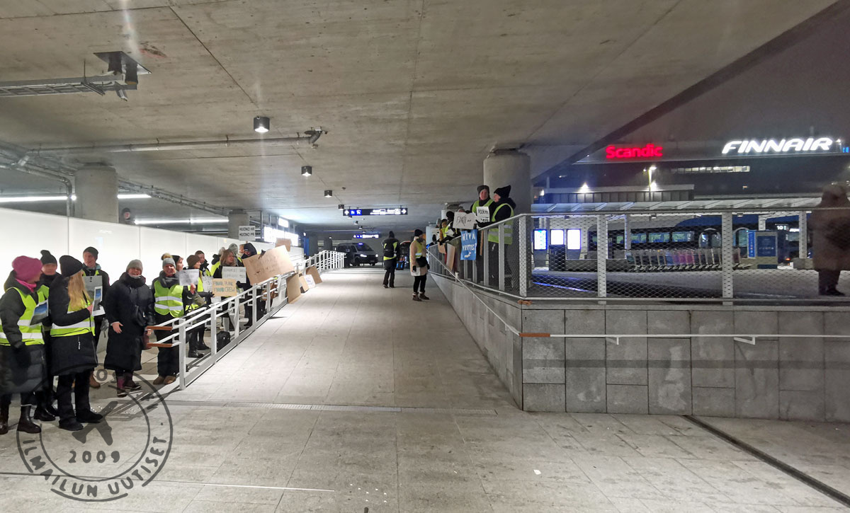 Satakunta finnairilaista on kokoontunut mielenilmaukseen Helsinki-Vantaan lentoaseman terminaalin tuloaulan sisääntulolle. Mielenilmaus on rauhallinen ja mielenosoittajat esittelevät saapuville ja lähteville matkustajille erilaisia iskulauseita liittyen Finnairin toimiin.