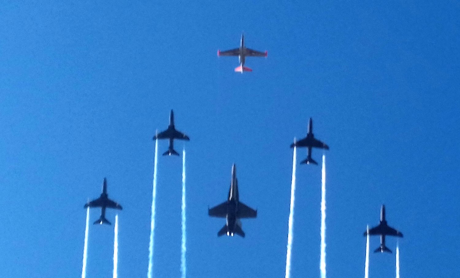 Tapahtuman päätti harvinainen muodostelma, jota veti historiallinen Fouga Magister. Midnight Hawks seurasi konetta molemmilla puolilla. Puljan täydensi F/A-18 Hornet -monitoimihävittäjä. T.T. Korjaus 12.30: tarkennettu Hornet-demojen lentäjät. Lue myös aiempia Lentoposti.fi-juttuja aiheesta: