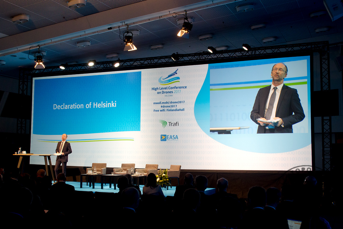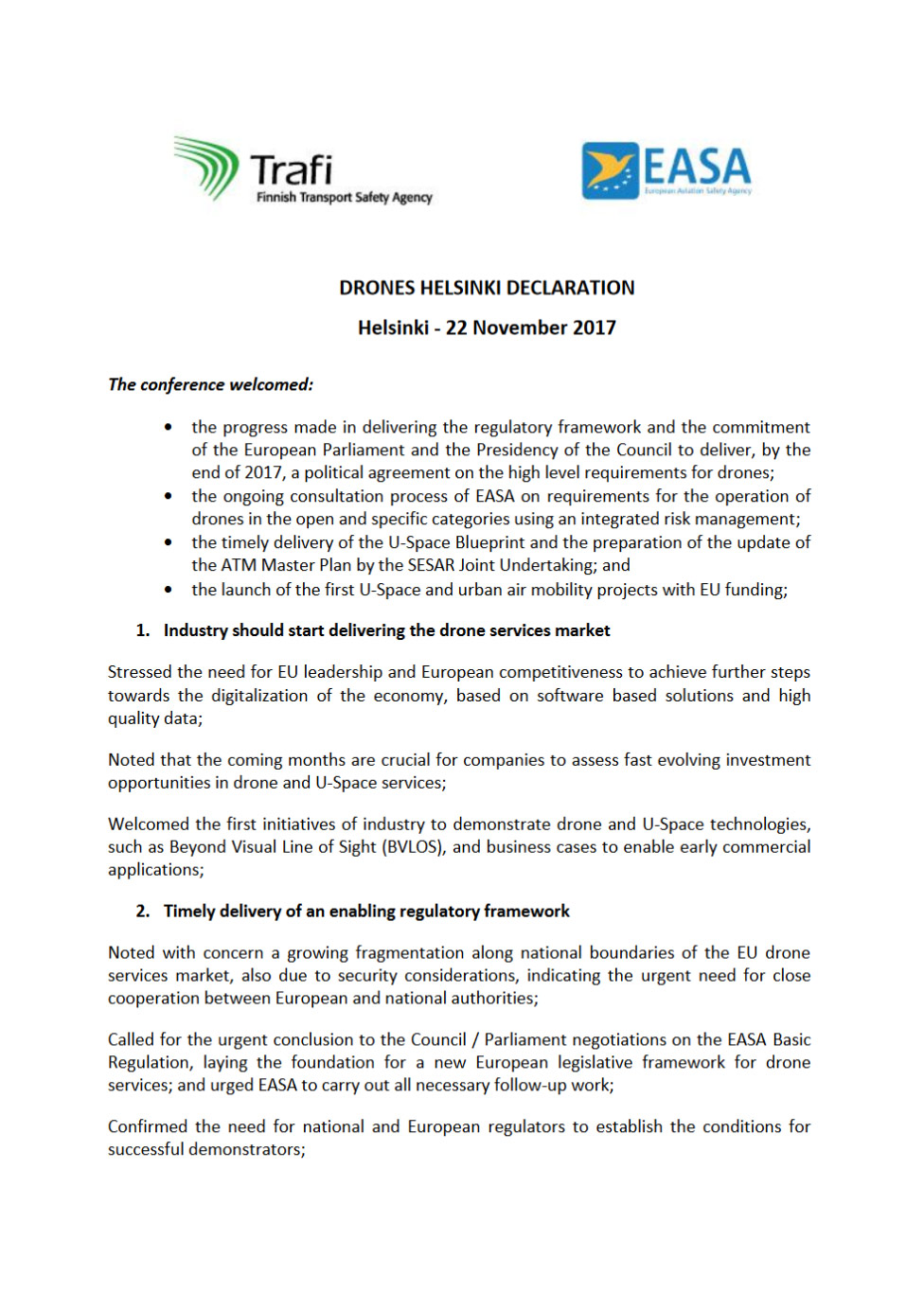 Helsinki Declaration päätti Finlandia-talolla liikenteen turvallisuusvirasto Trafin ja Euroopan lentoturvallisuusvirasto EASA:n yhteistyössä järjestämän High Level Conference on Drones -tapahtuman. Vastaavat julistukset drone-toiminnan edistämiseksi on tehty myös kahdesta aiemmasta kokouksesta, jotka järjestettiin vuosina 2015 ja 2016 Riiassa ja Varsovassa.