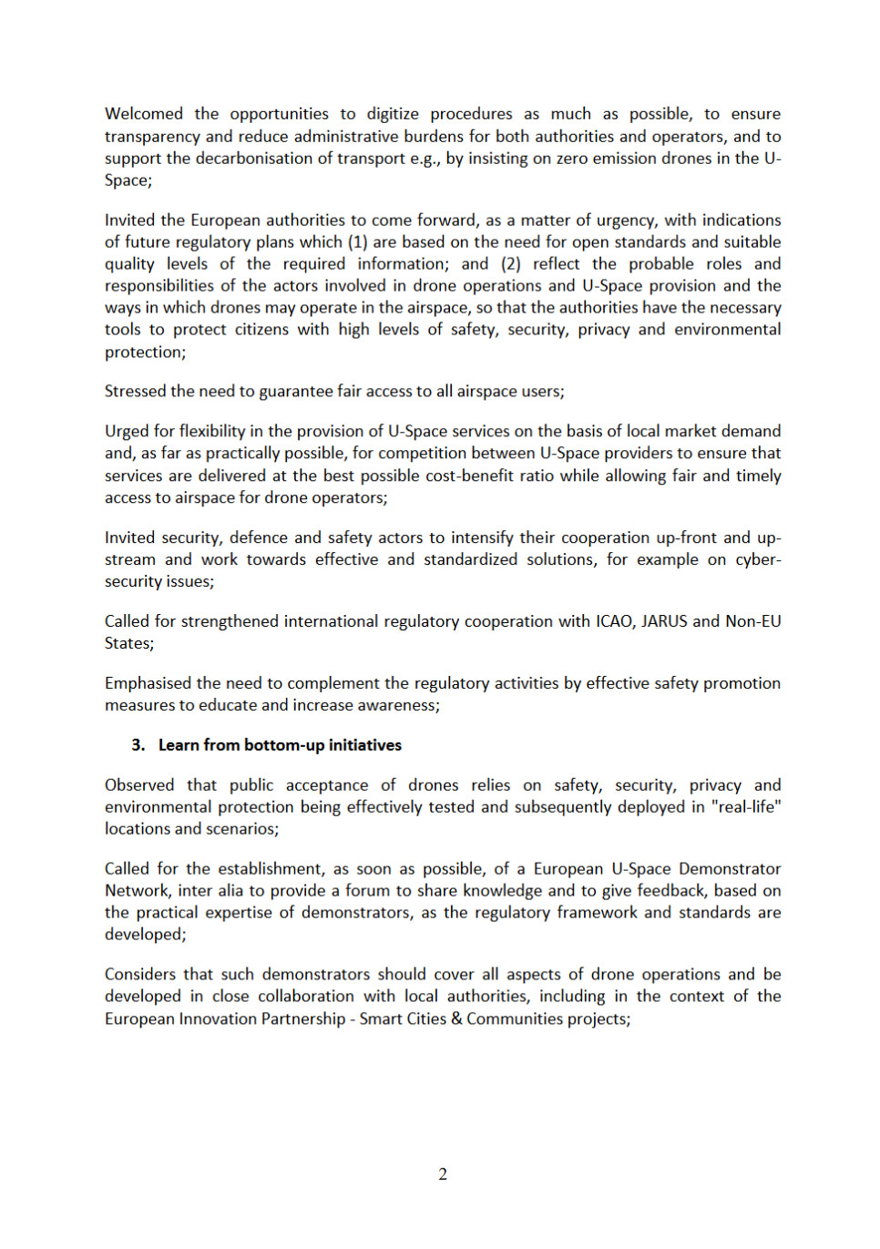 Kaikkien osapuolten tulee sitoutua avaamaan miehittämättömän ilmailun palveluita vuoteen 2019 mennessä työskennellen yhteistyössä julistuksen pääkohtien mukaisesti. Niistä ensimmäinen koskee droneja ja niiden operaattoreita koskevaa lainsäädäntöä, jonka tulee mahdollistaa turvallinen ja tehokas ilmatilankäyttö sekä taata kustannustehokkaiden U-space -palveluiden tarjoaminen. Miehittämättömän ilmailualan sääntely oli erityisenä huolenaiheena, sillä kasvava ala voi pirstaloitua kansallisten rajojen mukaisesti. Tarve Euroopan ja kansallisten viranomaisten läheiselle yhteistyölle on ilmeinen.