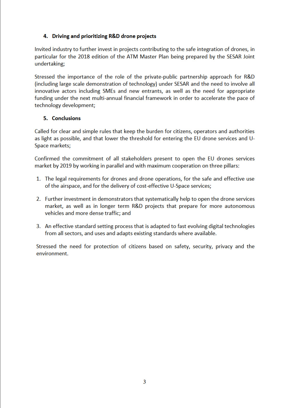 Helsingin Drone-tapahtuman jälkeisessä julistuksessa on nostettu esiin kolme pääkohtaa, joiden myötä on määrä varmistaa turvallisten kaupallisten drone-operaatoiden käyttöönotto koko alan kattavasti vuoteen 2019 mennessä.