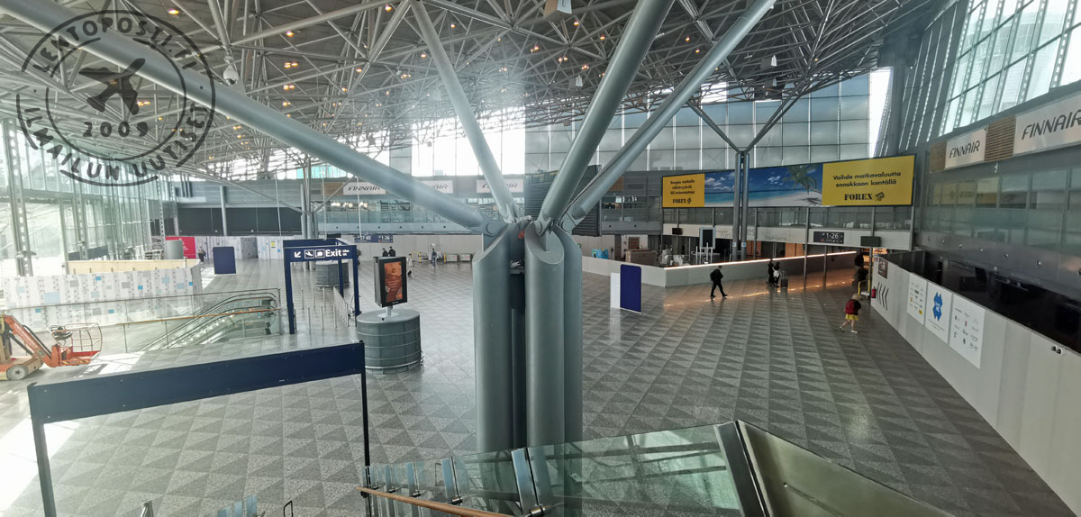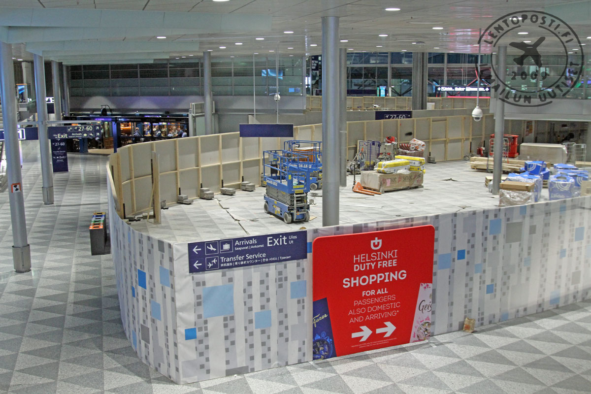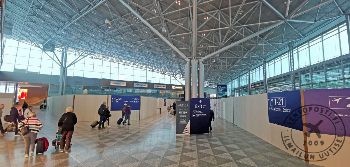 Nyt siihen on tulossa muutos kovaa vauhtia, sillä avara aulatila on muuttunut työmaa-aitojen peittämäksi sokkeloksi. Finavia on kuitenkin panostanut työmaa-alueen suunnitteluun ja kulkeminen on edelleen selkeää, leveitä ja suoria käytäviä pitkin. Kaikki palvelut löytyvät niiden varsilta ja opasteet ovat kunnossa.