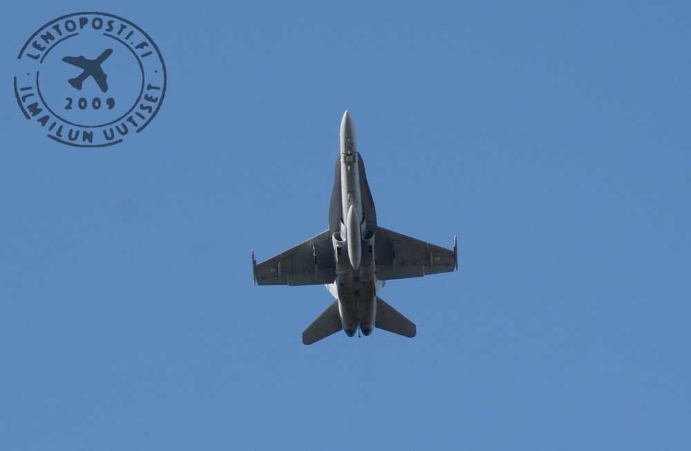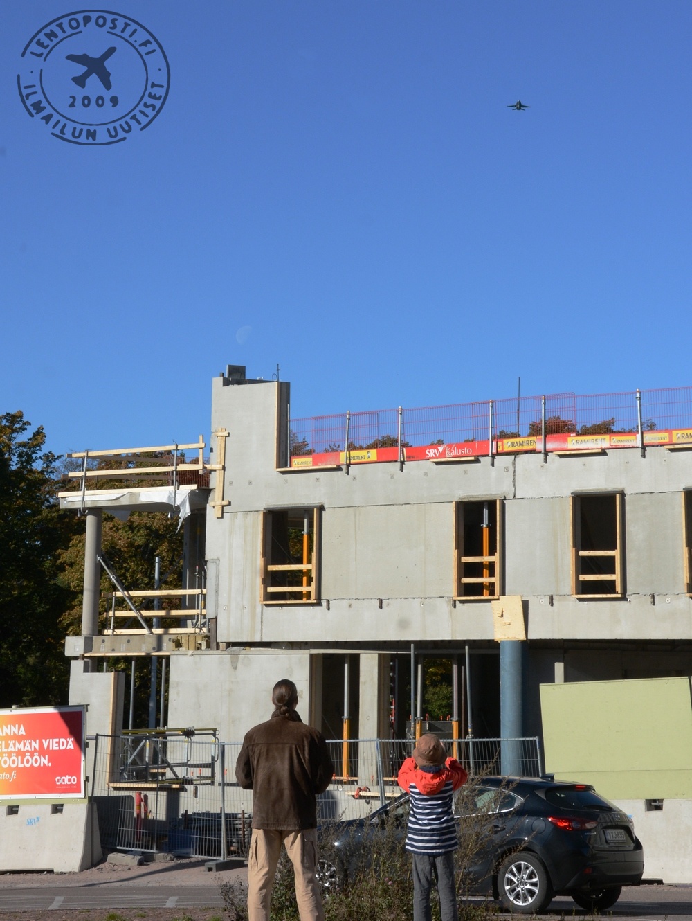 Rungon alle kiinnitetyllä lisäpolttoainesäiliöllä varustetun hävittäjän reitti kulki siunauskappelin itäpuolitse ja edelleen Kampin metroaseman yli (oikealla, klikkaa kuvat suuremmaksi). Helsingin eteläisten kaupunginosien päältä kone nousi jyrkällä nousukaarrolla luoteeseen kohti taivaan sineä. Hornetin jylinää ei voinut olla huomaamatta koko Helsingin niemellä. Sen tietäen Ilmavoimat oli kertonut ylilennosta jo hyvissä ajoin. Tiedote saikin runsaasti julkisuutta mediassa. Niinpä harvinainen ylilento yhdistettynä upeaan syyssäähän keräsi runsaasti katsojia Hietaniemen hautausmaan ympäristöön. Vanhan Kappelin lähistöllä oli satakunta katsojaa.