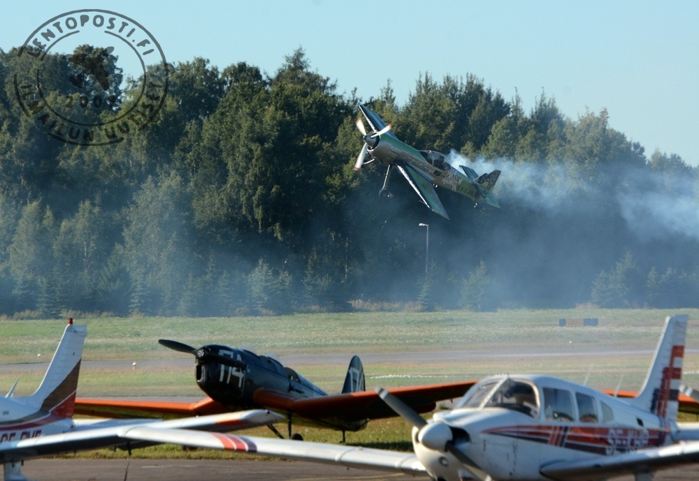 Rocketman joutuikin tyytymään normaaliin siipihaalarihyppyyn ja sen jälkeiseen laskeutumiseen laskuvarjon varassa. Näytöksen toisen jakson yllättäjä oli AirBanditsin Jakovlev Jak-52 -pari. Kookkaat koneet, runsaat savut ja rouhea äänimaailma yhdistettynä tiukkaan puljaan tarjosivat mukavan esityksen.