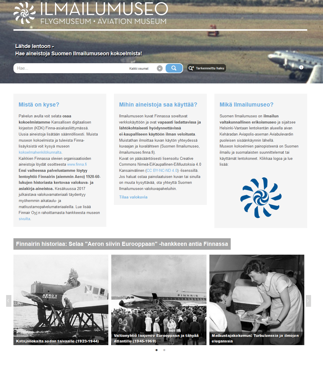 Finnairin rahoittamassa Aeron siivin Eurooppaan -hankkeessa on aiemmin siirretty Finnaan Aero Oy:n arkistokuvia. Hankkeessa avataan julkiseen käyttöön laaja kuva- ja arkistomateriaalipaketti. Se käsittää ajanjakson kotimaisen lentomatkustamisen ensimmäisiltä vuosikymmeniltä, 1920-luvulta aina 1960-luvun loppuun saakka. Ensimmäisessä vaiheessa kesäkuussa 2017 julkistettiin kaikkiaan 940 arkistovalokuvaa Finnairin historiasta, keskimäärin kymmenen otosta jokaiselta yhtiön toiminnan vuodelta. Nyt Finnaan lisättiin digitoituna 530 kappaletta Aero Oy:n pienpainatteita Ilmailumuseon kokoelmista. Aineistoa on yli 2200 sivua. Finna.fi tarjoaa yli 13 miljoonaa näkökulmaa kulttuuriperintöömme. Finna-sivujen käyttömäärät ovat jatkuvassa kasvussa ja vuosittain niillä on yhteensä jo yli 20 miljoona käyntikertaa. Finna on osa opetus- ja kulttuuriministeriön Kansallinen digitaalinen kirjasto -hanketta.