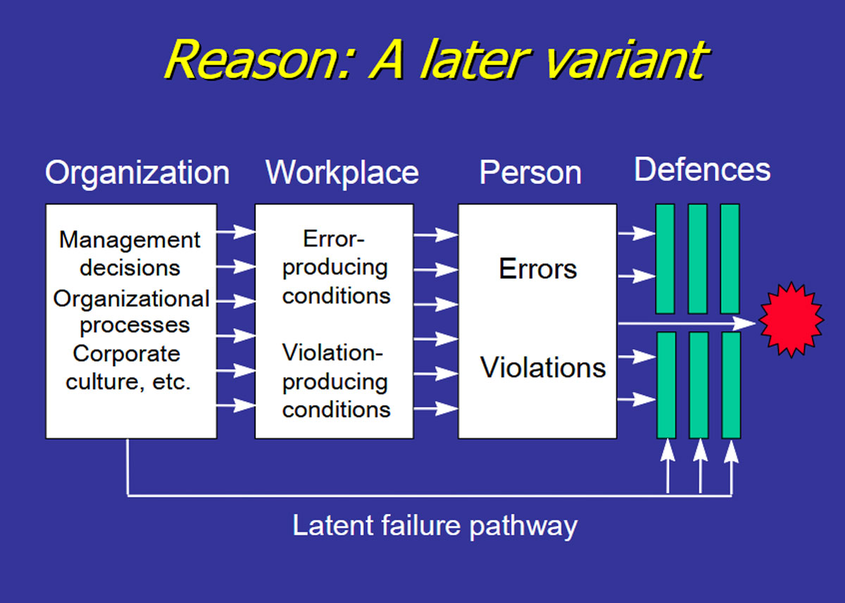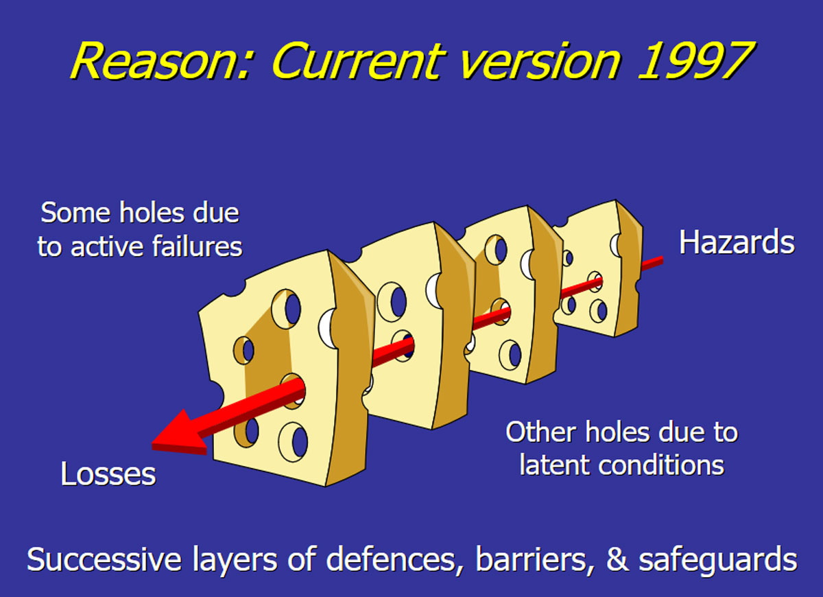 Reasonin mallissa jatkuvasti liikkuvissa juustosiivuissa on reikiä. Silloin, kun reiät muodostavat läpäistävän suoran voi tapahtua katastrofaalinen onnettomuus. Tuolloin kaikki onnettomuuden estämiseksi suunnitellut turvaverkot on läpäisty. Tämä kuvaa sitä miten monen asian epäonnistumisesta esimerkiksi lento-onnettomuuksissa usein on kyse. Kansainvälisen siviili-ilmailujärjestö ICAO:n inhimilliset tekijät ja lentoturvallisuustyöryhmä otti Reasonin mallin käyttöön viitekehyksenä 1990-luvun alussa. Asiaa veivät eteenpäin ICAO:ssa australialaisen ATSB:n (Australian Transport Safety Bureau) eli entisen BASI:n (Bureau of Air Safety Investigation) inhimillisten tekijöiden onnettomuustutkija Rob Lee sekä kyseiseen ICAO:n työryhmään kuulunut inhimillisiin tekijöihin keskittynyt kapteeni Dan Maurino.
