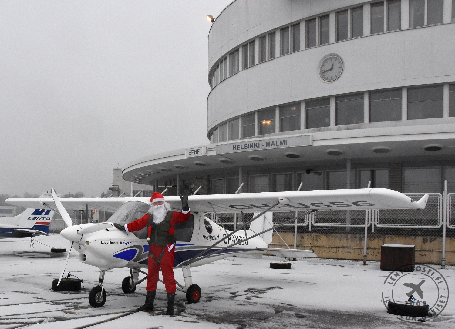Joulupukkia vastassa lentoaseman päärakennuksen eli pyöreän terassilla oli noin sata ihmistä, heistä melkoinen osa lapsia. Sumuinen sää ei toki oikeasti sallinut lentämistä, mutta lasten iloksi Pukki "laskeutui" Ikarus C42C -ultrallaan kiitotielle 36 ja rullasi odottavan yleisön eteen - tosin pyöräyttäen ensin ympyrät seisontatason lumipeitteseen.