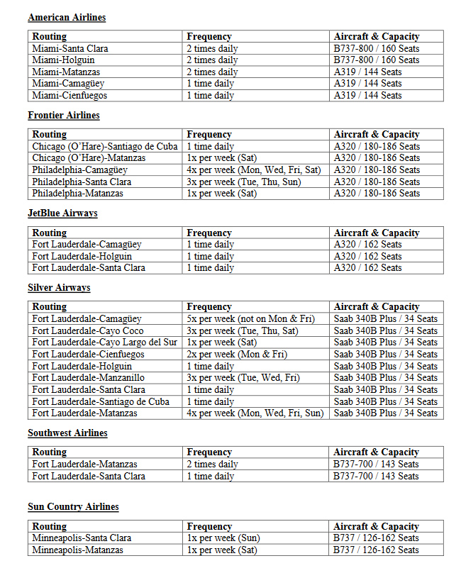Syksyn 2016 aikana on luvassa yhdeksän uutta yhteyttä Miamista, Fort Lauderdalesta, Chicagosta, Philadelphiasta ja Minneapolis/St. Paul:sta Kuubaan. Kohteita ovat Camagüey, Cayo Coco, Cayo Largo, Cienfuegos, Holguín, Manzanillo, Matanzas, Santa Clara ja Santiago de Cuba. Havannan osalta Yhdysvaltain liikenneministeriö sai pyyntöjä lähes kuudenkymmenen päivittäisen lennon osalta. Päätöksen Yhdysvaltain ja Havannan reittien osalta tehdään myöhemmin kuluvan kesän aikana.