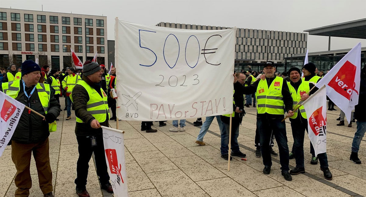 Keskiviikkoinen lakko vaikutti Berliinin Brandenburgin lentoasemalla kaikkeen sinne suuntautuvaan ja lähtevään lentoliikenteeseen. Lakko alkoi aamusta ja päättyy illalla. Mielenosoittajat kokoontuivat terminaalin edustalle Willy-Brandt-Platzille aamulla kello 08.00.