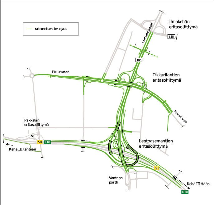 Lentoasemantien alueen urakassa Lentoasemantien yhteyteen rakennetaan kaksi uutta eritasoliittymää: Lentoasemantien eritasoliittymä ja Tikkurilantien eritasoliittymä. Tämän Kehä III:n parantamisen toisen vaiheen hinta on 45,7 miljoonaa euroa. Urakan tekee Graniittirakennus Kallio Oy. Lue myös: