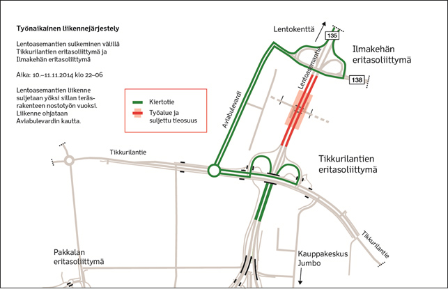 Lentoasemantie suljetaan Tikkurilantien eritasoliittymän ja Ilmakehän eritasoliittymien välillä. Liikenne ohjataan kulkemaan Aviabulevardin kautta. Tien sulkemisen aikana alueella nostetaan ylös Karhumäen sillan teräskehikko, joka vaatii muun muassa kahden nosturin asemoimista ajoradalle. Karhumäen kevyenliikenteen sillalla alkaa noston jälkeen varustelu- ja viimeistelytyöt.
