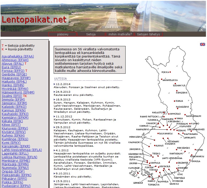 Lentopaikat.net siirtyy Ilmailuliiton omistukseen sivuston kehittäjältä Pekka Lehtiseltä. Suomessa on yli 50 virallista valvomatonta lentopaikkaa eli korpikenttää tai pienlentokenttää. Lentopaikat.net on keskittynyt niiden esittelemiseen. Vetovastuu siirtyy Suomen Ilmailuliitolle 4. huhtikuuta 2014. "Ilmailuliitto on oikea taho Lentopaikat.net -palvelun jatkajaksi ja kehittäjäksi. Sen tavoitteena on Lentopaikat.netin alkuperäisen linjauksen mukaisesti ilmailijoiden palveleminen eikä kaupalliset syyt", kertoo sivuston perustaja Pekka Lehtinen Lentoposti.fi:lle. Aiemmin Ilmailuliitto ilmoitti hankkineensa Finavialta 14. helmikuuta alkaen VFR Suomi -palvelun. SIL vastaa harraste- ja yleisilmailun hyödyntämän julkaisun jatkokehittämisestä. Finavia tuottaa edelleen tietoja sinne omasta toiminnastaan, mutta päivitys ja ylläpitovastuu on Suomen Ilmailuliitolla. VFR Suomi sisältää perustiedot VFR-lentämisestä ja valvomattomista lentopaikoista Suomessa. "Liiton tarkoituksena on kehittää monipuolisesti harrasteilmailijoita palveleva verkkosovellus, johon sekä Lentopaikat.net ja VFR Suomi integroidaan", sanoo Ilmailuliiton toiminnanjohtaja Timo Latikka. "Lentopaikkojen päälliköt ja toimijat ovat jatkossakin avainasemassa, jotta ilmailijoille saadaan oikeat ja riittävät tiedot hyvään lennonsuunnitteluun. Liitossa tämä nähdään harrasteilmailun edistämisenä ilmailijoilta ilmailijoille." Lentopaikat.net on palvellut yleisilmailijoita keväästä 2004 lähtien. Kävijämäärät lähtivät palvelun julkistuksen jälkeen kovaan kasvuun ja 10 000 kävijän raja rikkoutui jo syyskuussa 2004. Palvelulla on kuukausittaisia kävijöitä noin 2500. Ilmailuliitto etsii nyt hankkimilleen sivustoille kehittäjää. Tarjolla on suunnittelun, toteutuksen ja nykyisten tietojen päivittämistä. Mahdollisesta palvelun ylläpitopäivityksestä sovitaan erikseen. Ilmailuliiton hakuilmoitus ylläpitäjästä: Ilmailu.fi Päivitys: 28.2 Pekka Lehtisen kommentti. Lue myös: