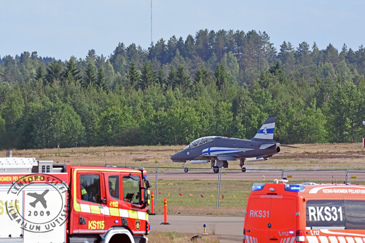 Koneen ohjattavuus säilyi pitkään mutta oikean pääpyörän puhkeamisen ja jarrupaineiden loppumisen johdosta kone ajautui laskukiidon loppuvaiheessa 35 kilometrin tuntivauhdilla ulos kiitotieltä pysähtyen sen ja rullaustien väliselle nurmialueelle. Pelastusajoneuvot varmistivat tilanteen eikä tapauksessa syntynyt henkilövahinkoja (kuva yllä). T.T. Lue lisää Tikkakosken Ilmavoimat 100 -näytöksestä ja Hawk-vaaratilanteesta: