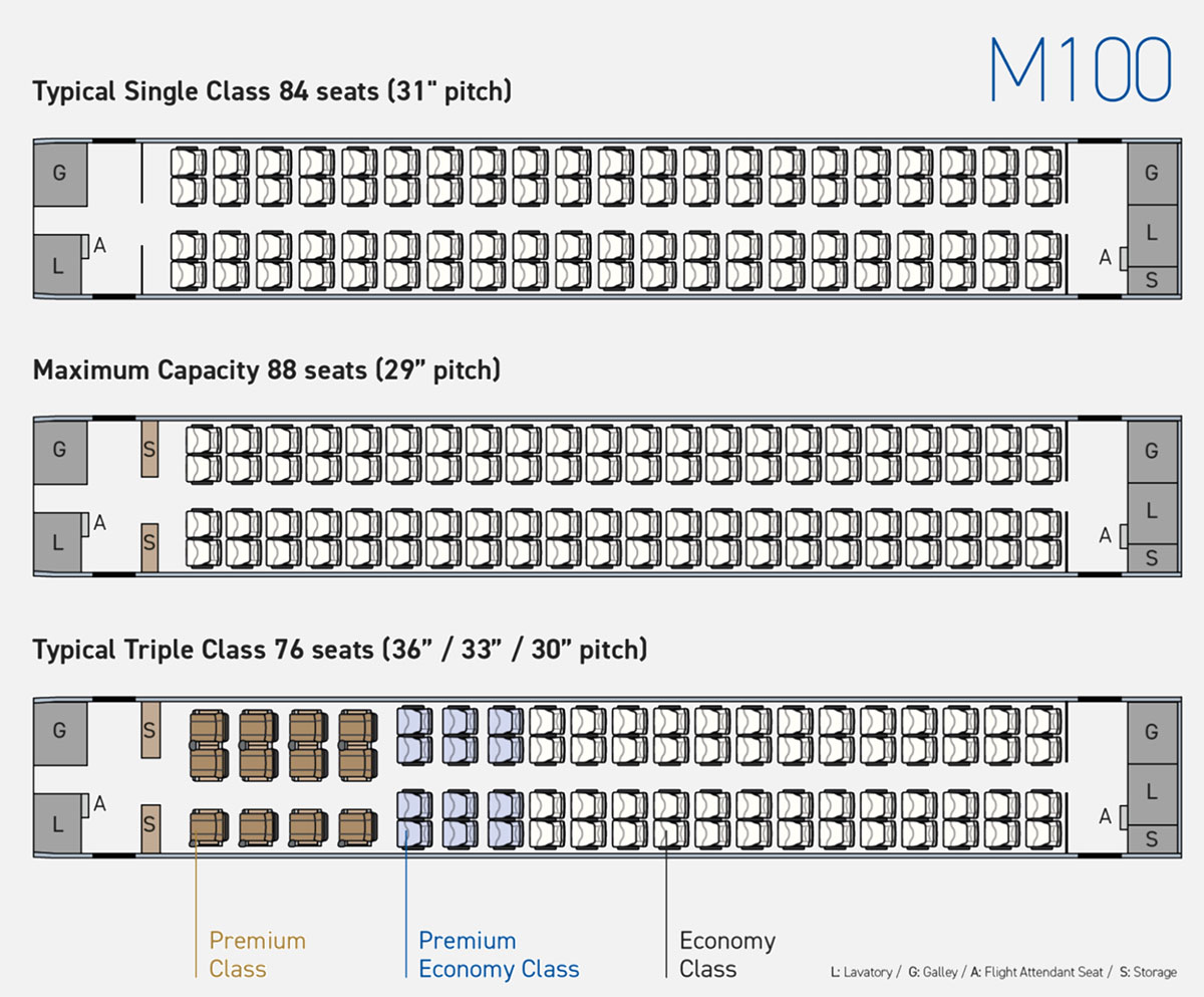 M100 on optimoitu 65-76-paikkaiseksi mutta se voidaan tarvittaessa muuntaa maailmanmarkkinoille jopa 88-paikkaiseksi. Uusi M100 -kone on 1,1 metriä pidempi kuin aiempi MRJ70, mutta hieman epäloogisesti 1,3 metriä lyhyempi kuin M90. Suuremman M90-koneen matkustamoon voidaan asentaa 76-92 matkustajaistuinta. SpaceJetin matkustamon korkeus on 202 cm ja halkaisija 276 cm. Matkustajaistuimet ovat 2+2 konfiguraatiossa ja niiden leveys on 18,5 tuumaa eli 47 cm. Matkatavarahyllyille on mahdollista asettaa maksimissaan 58cm x 37cm x 25cm -kokoinen vetolaukku. Yhdysvallat on regionaalikoneiden suurin markkina ja sitä hallitsevat nykyisin Bombardier ja Embraer. Kaikkiaan 63 prosenttia USA:n kentistä on sellaisia, joille operoidaan ainoastaan regionaalikoneilla. Vuonna 2018 Yhdysvalloissa avattiin yli 110 uutta reittiä juuri regionaalikoneilla.