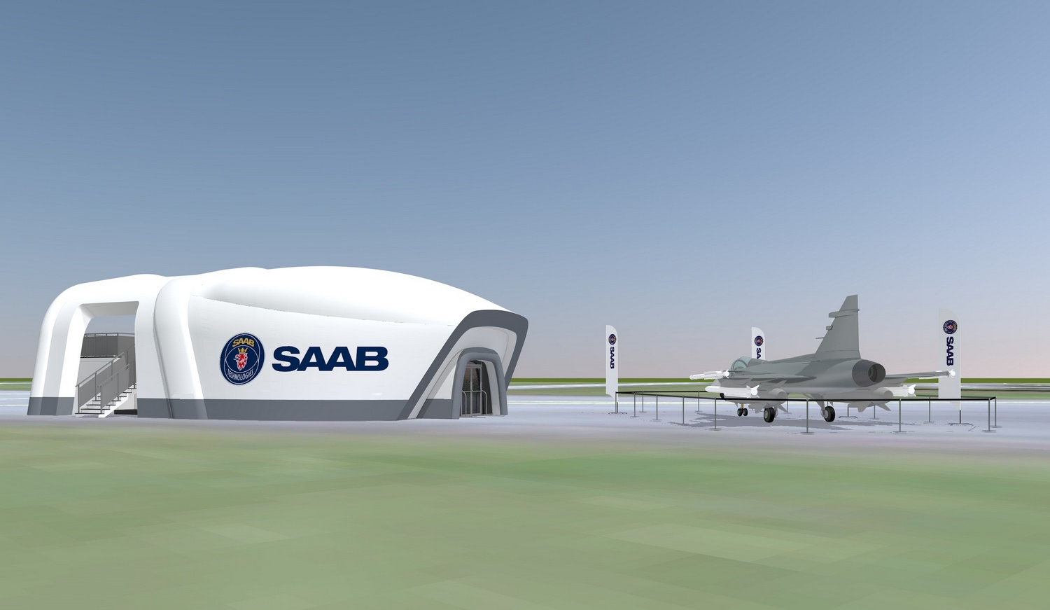Uutta Gripeniä ei Rissalassa vielä nähdä. Paikalla on kuitenkin aiempi malli JAS 39 C. Kone on esillä Saabin osaston lähellä. Lentokonevalmistajien vain tapahtuman ajaksi pystytettävät, näyttävät VIP-vieraille tarkoitetut chalet-paviljongit ovat tuttuja suurista lentonäytöksista kuten Farnborough Air Show'sta.