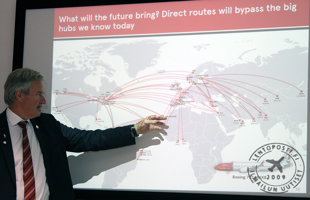 Norwegianilla on nykyisin reittiverkostossaan 14 kaukoreittiä, jotka suuntautuvat pääasiassa Yhdysvaltoihin, joka on ollut yhtiön pääkohde. Vuoden 2017 aikana kaukoreittejä käynnistetään jopa 50 kohteeseen. Vuoden 2016 aikana Norwegian ylitti jo kolmen miljoonan kaukoliikennematkustajan rajan vaikka lennot oli aloitettu vasta vuonna 2013. Nykyisin Norwegianilla on 20 hubia kymmenessä eri maassa. Reittejä on kaikkiaan 450 ja eri kohteita 140. Yhtiön lentokoneiden keski-ikä on vain 3,6 vuotta ja se aiotaan pitää alhaisena jatkossakin. "Lentoyhteydet tulevat siirtymään suurten hubien ulkopuolelle uusien kapearunkokoneiden myötä", sanoo Norwegianin toimitusjohtaja Bjørn Kjos Helsinki-Vantaalla. Kjos maalaili transatlanttiseen liikenteeseen jopa 50 dollarin alkaen hintoja nykyisen 69 dollarin sijaan. Kaukorettiverkostoa suunnitellaan laajennettavaksi Boeingin 737 MAX 8 -koneilla, koska niillä voidaan operoida entistä kauemmas. Suunnitelmat ovat samanlaisia kuin aiemmin on kerrottu uusien Airbus A321LR -koneiden tilauksen yhteydessä (Lentoposti.fi kertoi aiheesta uutisena heinäkuussa 2016). Norwegianin hubit Tukholma, Kööpenhamina, Madrid, Barcelona, Las Palmas, Lontoo, New York sekä mahdollisesti Boston ja Toronto mahdollistavat merkittävän laajan reittiverkoston lyhyille kaukoreiteille uusilla pidemmän kantaman mahdollistavilla Boeing 737 MAX ja Airbus A321LR -koneilla. Uudet kapearunkoiset mahdollistavat transatlanttisen liikenteen lisäksi kaukoreitit esimerkiksi Barcelonasta ja Madridista pitkälle Afrikan manterelle, Las Palmasista Etelä-Amerikkaan sekä Tukholmasta ja Kööpenhaminasta Kaakkois-Aasian kohteisiin. "Helsinkiin saapuminen on edelleen suunnitelmissa. Toistaiseksi meillä ei ole ollut tarvittavaa kapasiteettia aloittaa liikennöintiä. Pidän mahdollisena aloitusta vuoden 2018 aikana", kommentoi Kjos laajentumissuunnitelmia Lentoposti.fi:lle. "Helsinkiin tullaan laajarunkokoneella pitkien etäisyyksien takia. Toki myös kapearunkoinen on mahdollinen osalle reiteistä", jatkaa Kjos. Ensimmäiset kuusi Boeing 737 MAX 8 -konetta saapuvat Norwegianin laivastoon vuoden 2017 aikana. Kaikkiaan koneita on tilattu 100. Niiden lisäksi on optiot vielä 50 koneeseen. Ensimmäiset A321LR -koneet on määrä toimittaa Norwegianille vuoden 2019 aikana. Niitä on tilattu 30 kappaletta. Norwegian aloitti kaukoliikenneoperaatiot vasta reilut kolme vuotta sitten keväällä 2013. Yhtiöllä on tällä hetkellä kahdentoista Boeing 787-8 ja -9 Dreamlinerin kaukoliikennelaivasto. Yhtiön kaukolentolaivastossa on 42 Dreamlineria vuoteen 2020 mennessä. Toimitusjohtaja Kjos tarkensi Vantaan vierailunsa aikana, että määrä on vähintään 42 konetta mutta jopa 50 konetta olisi mahdollista vuoteen 2020 mennessä. Nykytiedon valossa Norwegianin kaukoliikennelaivaston koko olisi 2020-luvulla jo lähes Finnairin ja SAS:n yhteenlasketun laivaston suuruinen. Lue myös: