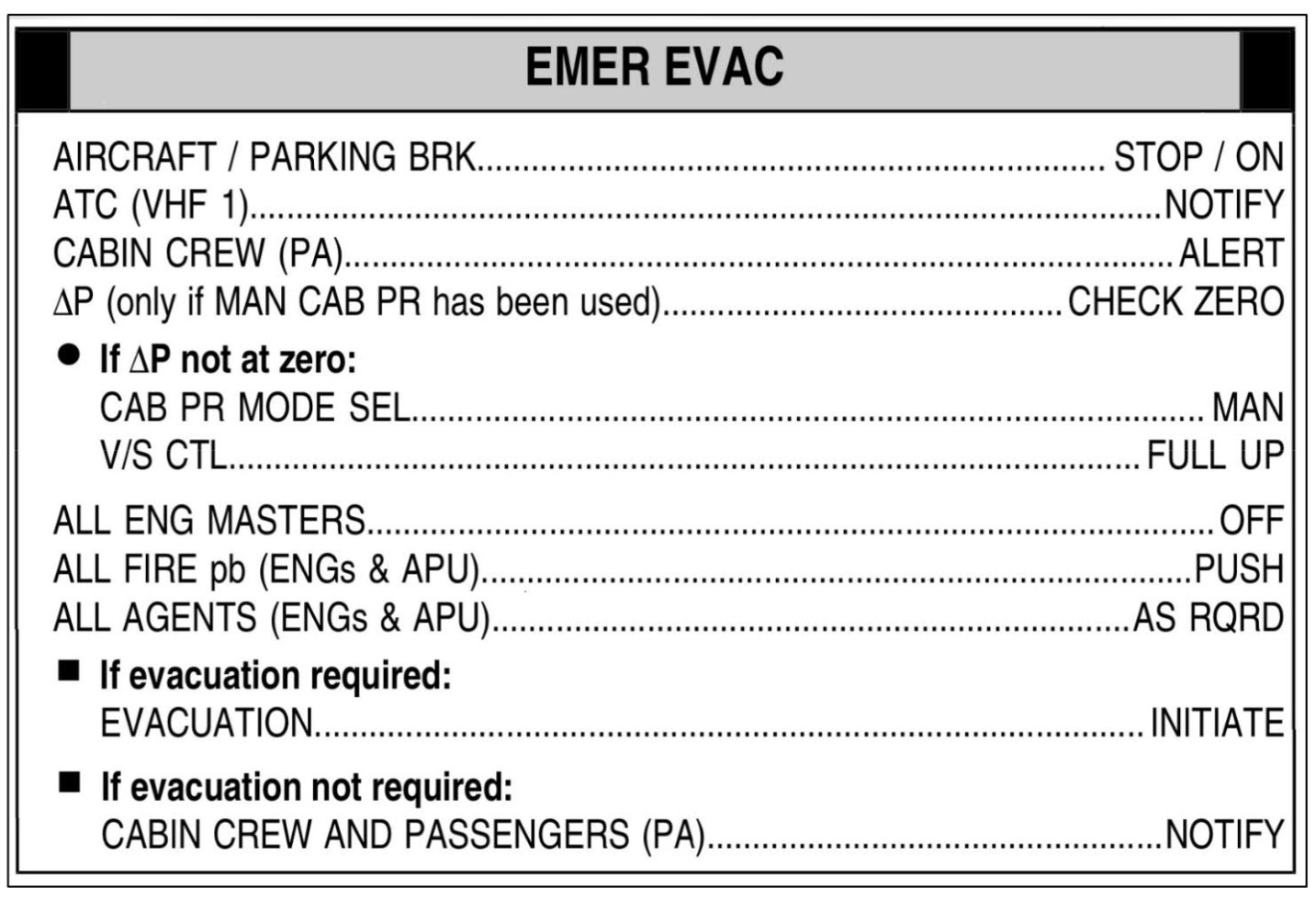 Airbus-koneen evakuointiohjeistuksen mukaan evakuointitilanteen tarkistuslistan toimenpiteet tulee suorittaa, mikäli evakuointia joudutaan harkitsemaan. Listan oikeanlaisen läpikäynnin jälkeen koneen moottorit on sammutettu ja tarpeen vaatimat palopullot (sammuttimet) mm. moottoreihin, APU-moottoriin tai ruumatilohin on laukaistu.