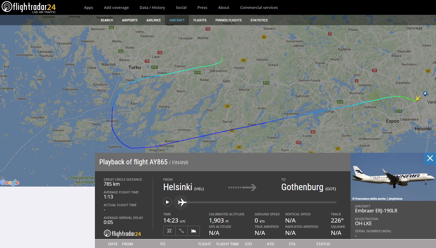 Norran Finnairin lennolla AY865 operoima kaksimoottorinen Embraer ERJ 190-100LR -suihkukone kääntyi Turkuun ehdittyään noin Kemiön saaren tasalle (FlightRadar24-tallenne alla). Onnistuneen laskeutumisen jälkeen koneen päällikkö päätti evakuoida yhdystielle pysähtyneen Embraerin hätäuloskäyntien ja niiden liukumäkien kautta. Lennolla oli 100 matkustajaa ja neljä miehistön jäsentä. Savunmuodostuksen syyksi paljastui Embraerin vasemman ilmastointiyksikön (Pack 1) ACM-jäähdytyslaitteen (Air Cycle Machine) leikkaaminen kiinni kun lentokone oli nousemassa matkalentokorkeuteen. Laitteen suurella nopeudella pyörivät roottorit hankautuivat laitteen kotelon sisävaippaa vasten ja se aiheutti kitkerää hajua sekä vaaleaa savua. Savu kulkeutui ilmastoinnin kautta koneen sisätiloihin. Varsinaista tulipaloa ei kuitenkaan ollut. Hankautuminen aiheutui liukulaakerien rikkoutumisesta. Tutkinnan aikana ei pystytty varmuudella määrittämään ensimmäisenä rikkoutunutta liukulaakeria. Laitteen puhaltimen sisävaipasta löytyi myös kosteita kahvinpuruja. Kahvinpurut olivat luultavasti peräisin etukeittiön pesualtaaseen kaadetuista kahvinpuruista.