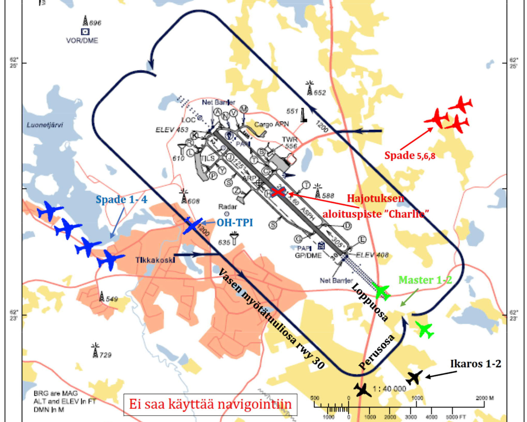 Ensimmäinen vaaratilanne tapahtui, kun Spade1-osasto lensi laskukierrokseen kiitotielle 30, tarkoituksenaan tehdä kiitotien päällä osaston hajotus laskuryhmitystä varten. Molemmat Spade-osastot olivat saapumassa lähialueella lähes samaan aikaan. Lennonjohtaja määräsi Spade1-osastolle korkeusrajoituksen 2000 jalkaa eli noin 600 metriä, koska vasemmassa myötätuulessa 1100 jalankorkeudella kiitotielle 30 lensi koulukone OH-TPI. Ennakoitua huonompi sää pakotti Spade1-osaston lentokorkeuden muutoksiin.