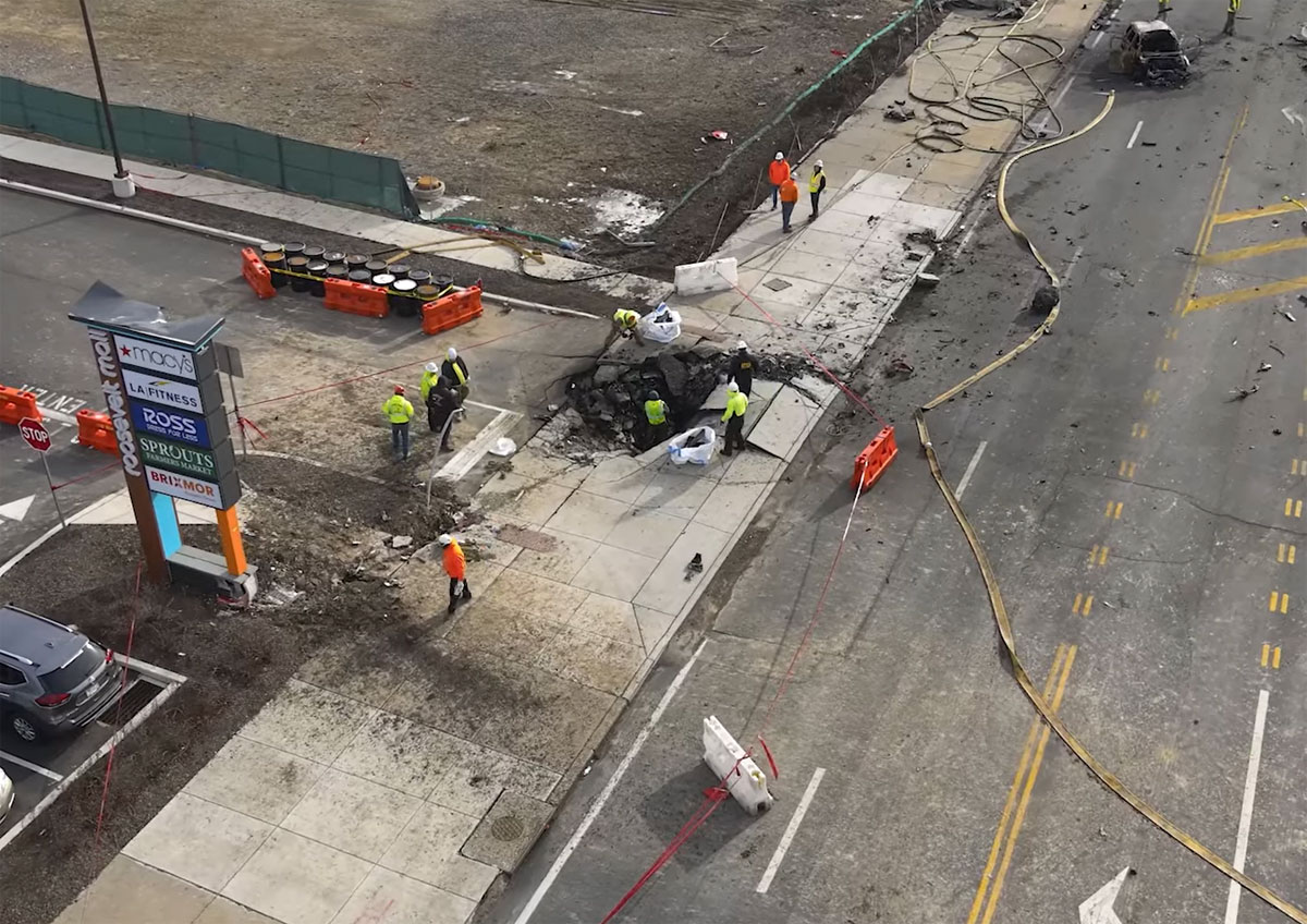 Hurjalla pystynopeudella noin 1500 jalan korkeudesta maahan syöksynyt liikelentokone teki ison ja syvän kuopan betoniselle jalkakäytävälle Philadelphiassa.