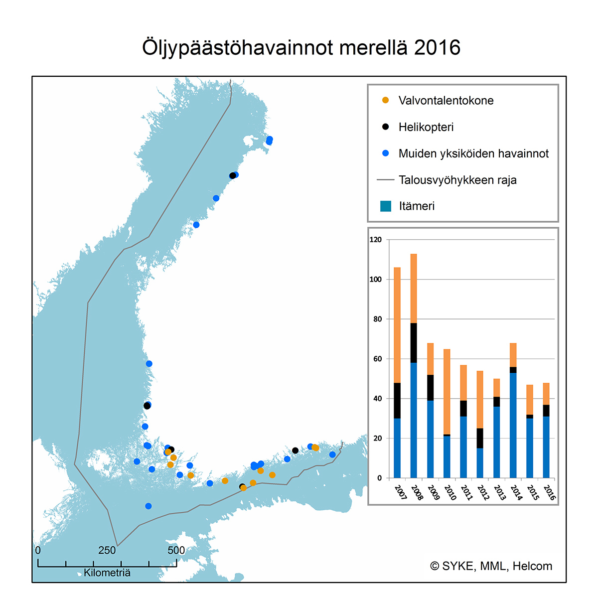 Itämeren suojelukomissio HELCOM velvoittaa rantavaltiot säännölliseen merialueiden lentovalvontaan. Vuoden 2016 aikana päästöjä havaittiin lähes yhtä paljon kuin edellisvuonna jolloin niitä löydettiin 47 kappaletta. Suomen Rajavartiolaitoksen Dornier DO228 -valvontalentokoneen laitteistoilla öljyn voi havaita pilvipeitteen läpi ja jopa kymmenien kilometrien päässä koneen lentoreitistä.