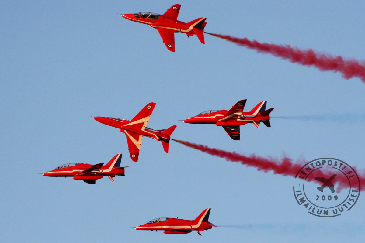Suomen Ilmailumuseon järjestämä Suomi 100 -lentonäytös Kaivopuiston edustalla Helsingissä on julkistanut jo useita osallistujia. Red Arrowsin tulo takaa yleisön kiinnostuksen. Yhdeksällä BAE Systems Hawk -suihkuharjoituskoneella lentävä ryhmä on kuuluisa tiukasta vinoneliömuodostelmastaan. Kokonaisuutta täydentää värillisten savujen käyttö. Kyseessä ei ole ensimmäinen kerta kun punaiset brittikoneet nähdään Kaivopuiston edustalla. Vuonna 1970 Red Arrows lensi siellä silloisilla Folland Gnat -koneillaan. Tuolloin esityskorkeudet olivat huomattavasti matalampia kuin nykyiset turvamääräykset sallivat. Aikalaiset muistelevat Gnattien sujahdelleen purjeveneiden mastojen välistä. Viimeksi Red Arrows on lentänyt Suomessa Kauhavan Lentäjien juhannuksessa 2006 (otsikkokuvassa). Ryhmä vieraili myös Lappeenranta International Air Show -tapahtumassa vuonna 1999. Englannin Suomen suurlähettiläs Sarah Price kuvailee Red Arrows-näytöstä ”Ison-Britannian lahjaksi satavuotiaalle Suomelle.” “Olen todella iloinen siitä, että Red Arrows saapuu Helsinkiin juhlistamaan Suomen 100-vuotista taivalta lentonäytöksellä. Red Arrows ja Eurofighter Typhoon hurmaavat yleisön ja osaltaan kertovat Ison-Britannian ja Suomen pitkäaikaisesta ystävyydestä sekä läheisestä puolustus- ja turvallisuusyhteistyöstä”, Price sanoo. Vuonna 1965 perustetut Red Arrowsit ovat esiintyneet lähes 5000 kertaa 57 maassa. Jo aiemmin tämä viikon keskiviikkona kerrottiin, että Kaivopuistossa nähdään myös RAF:n Eurofighter Typhoon -hävittäjä. Hienostuneen tyylikkäästi lentävän Red Arrowsin rinnalla Typhoon tarjoaa raakaa voimaa ja tiukkaa liikehdintää (lue lisää linkistä jutun lopussa). Kumpikin muodostuu varmasti yleisön suosikiksi. Kiinnostusta lisää varmasti sekin, että Eurofighter on yksi Ilmavoimien Hornetin seuraajaehdokkaista.
