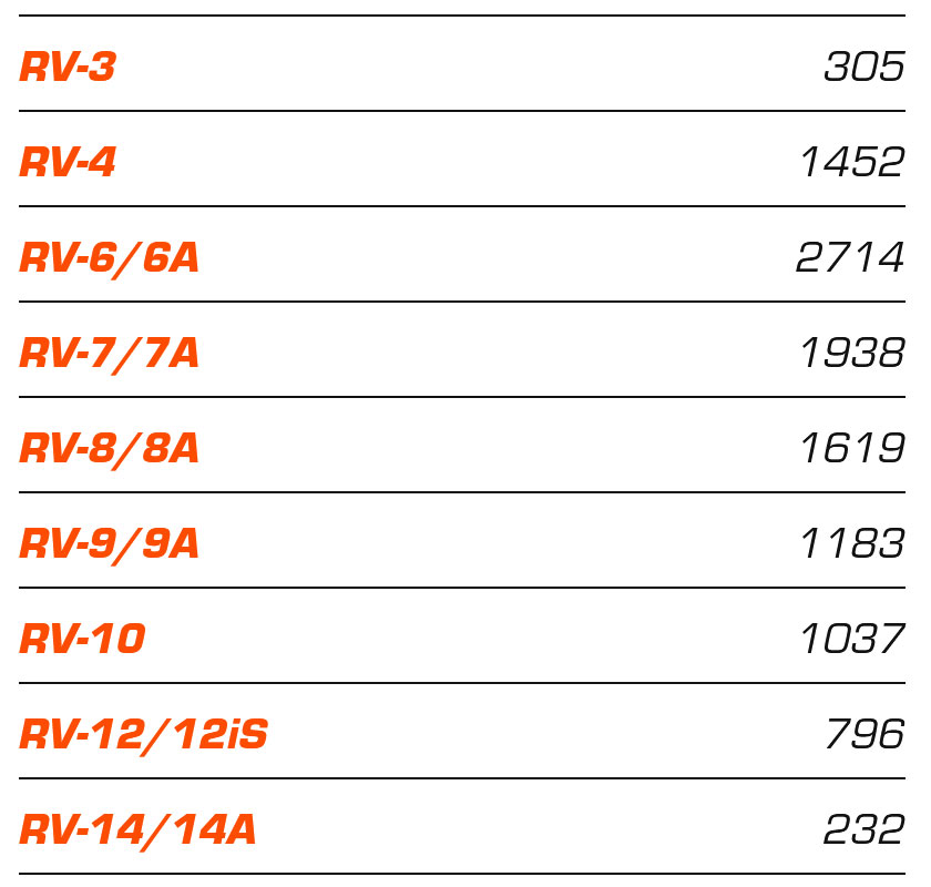 Van's Aircraftin RV-konetyyppejä on valmistunut 11 276 kappaletta. Näistä 1-4 -paikkaisia Van's RV-konetyyppejä ovat RV-3, RV-4, RV-6, RV-7, RV-8, RV-9, RV-10, RV-12, RV12is, RV-14 ja prototyyppivaiheessa oleva RV-15. Näistä RV-6:n ja RV-12:sta valmistus on päättynyt. Van's Aircraftin valmistamia experimental-luokan koneita lentää Suomessakin.