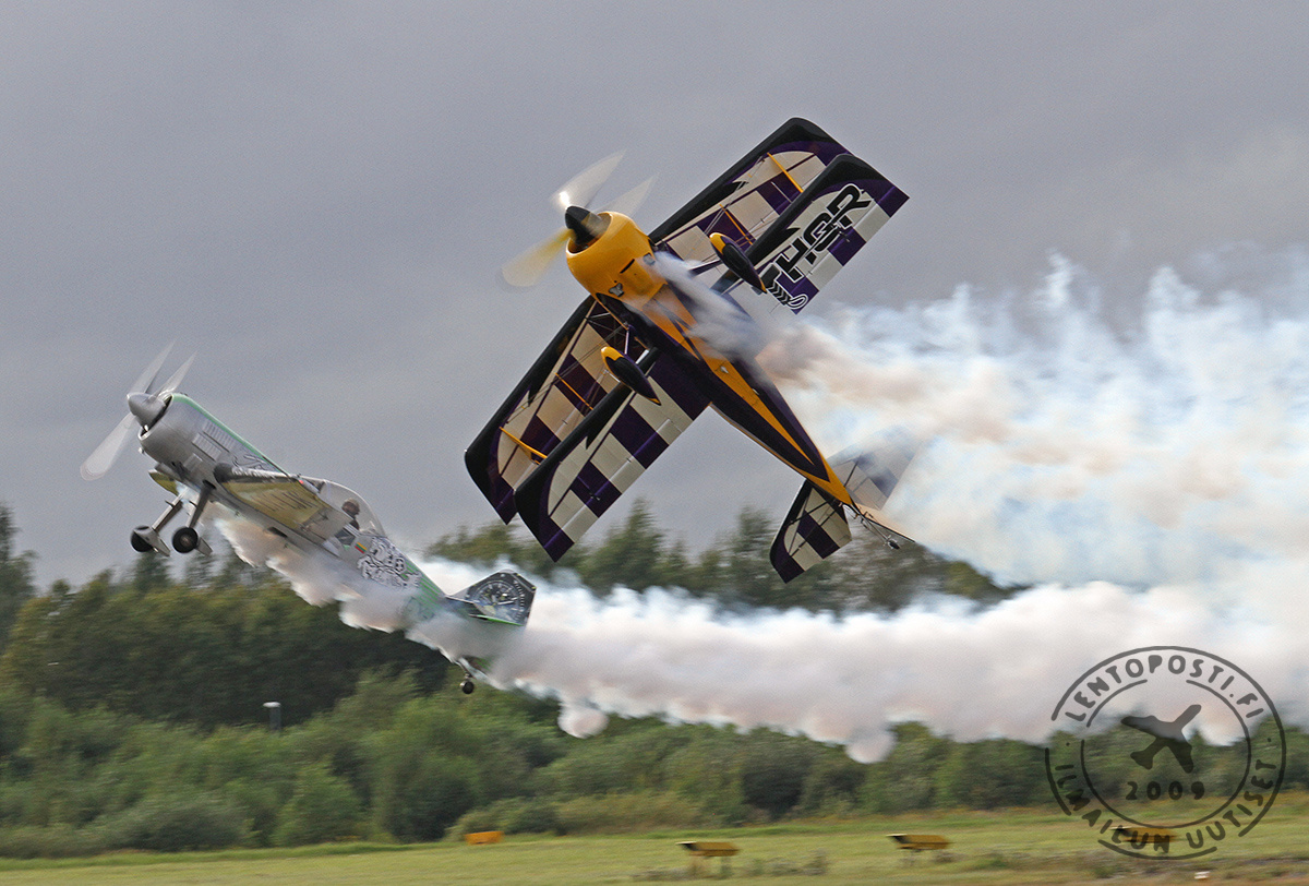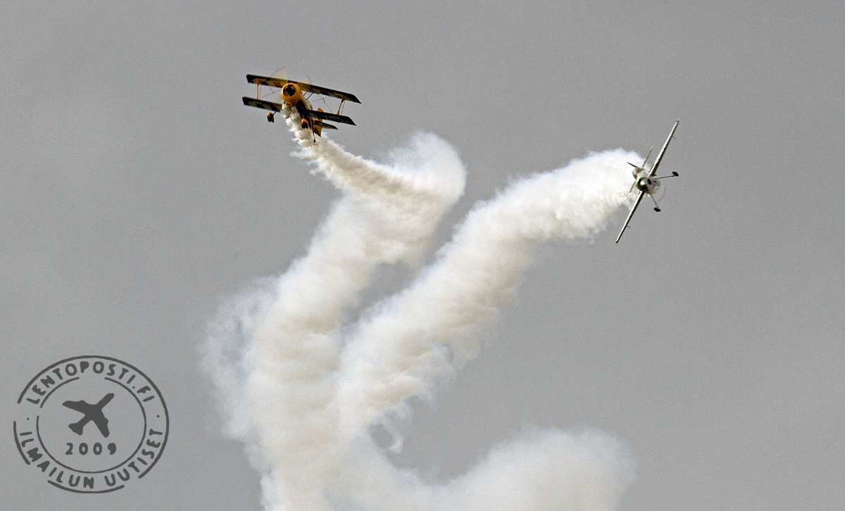 Luvassa oli nimittäin päivän parasta taitolentoa. Kaksi taitavaa pilottia ja kaksi erittäin tehokasta konetta loihtivat Malmin taivaalle upean esityksen (otsikkokuvassa).