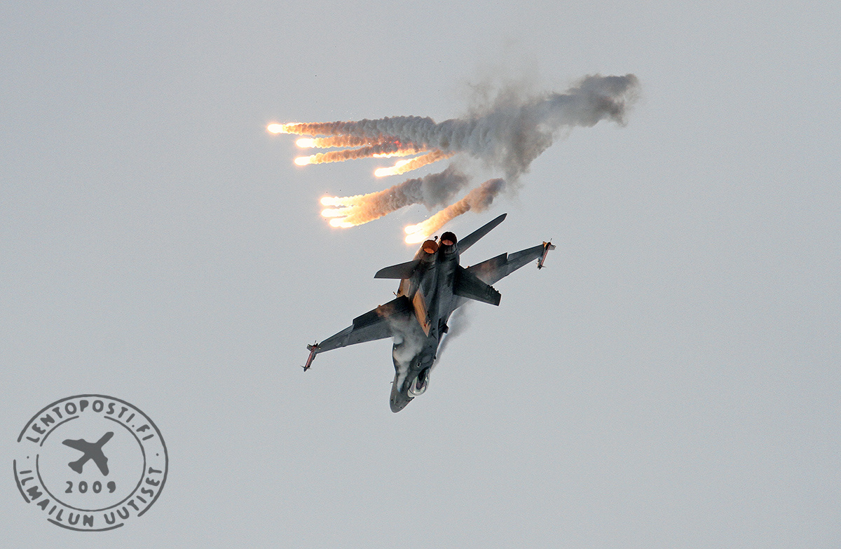 Kellon lähetessä viittä taivas vähitellen avautui ja koneet saatiin taivaalle. Midnight Hawksit lensivät kuuden maissa ja Hornet puolta tuntia myöhemmin. Tuolloin aurinko vilkahteli ja sinistä taivastakin oli näkyvissä. Näytöksessä HN käytti totuttuun tapaan omasuojaheitteitä eli soihtuja elävöittämään korkeita liikkeitä.