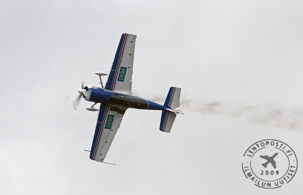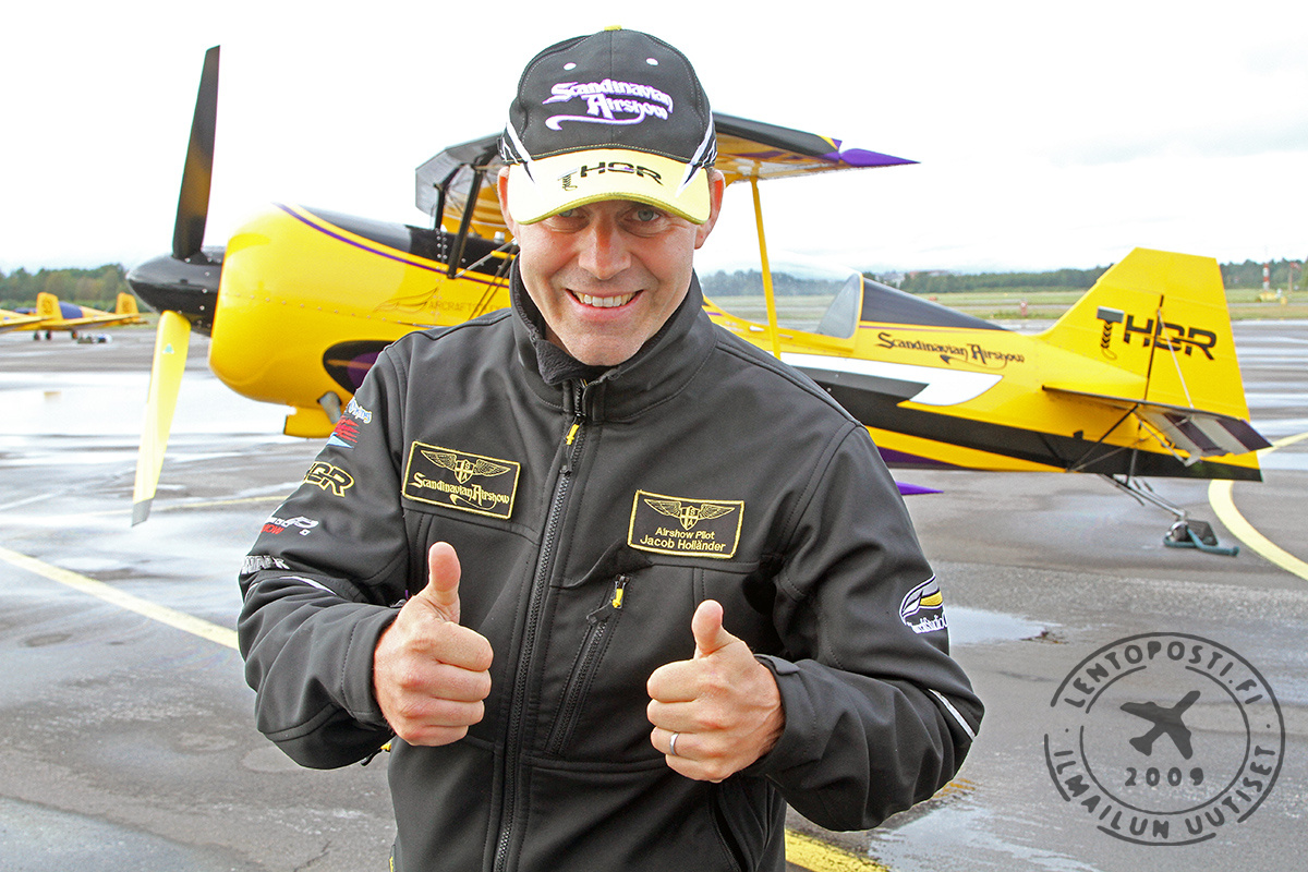 Aamupäivän näytösosuuden kiinnostavimmasta esityksestä vastasi ruotsalaisen Jacob Holländerin (oikealla, klikkaa jutun kuvat suuremmaksi) lentämä Pitts 12S "Thor" -kaksitaso.