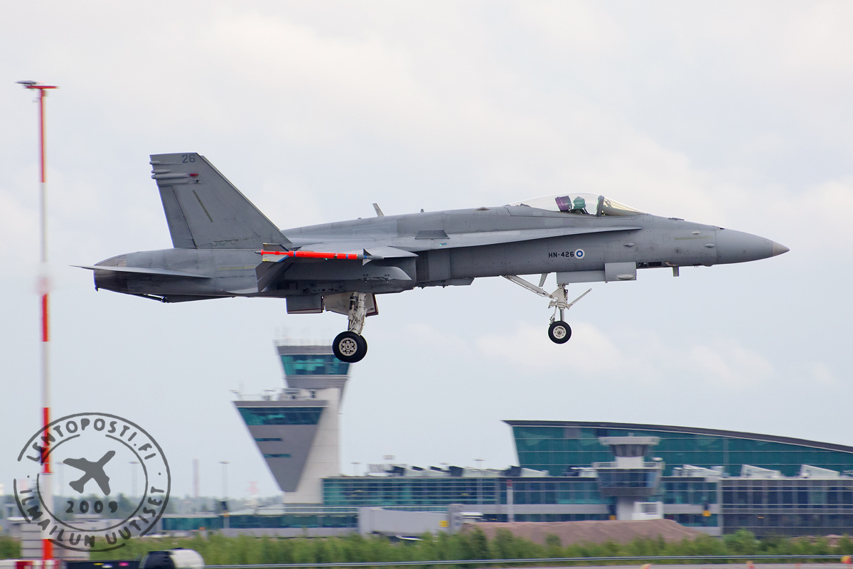 Sekä Midnight Hawks että F/A-18 Hornet laskeutuivat esityksiensä jälkeen Helsinki-Vantaan kiitotielle 22R (vasemmalla). Hornetit ovat satunnaisesti QRA-päivystäneet (Quick Reaction Alert) kentällä, mutta Hawkien operointi Vantaalta on todella harvinaista.