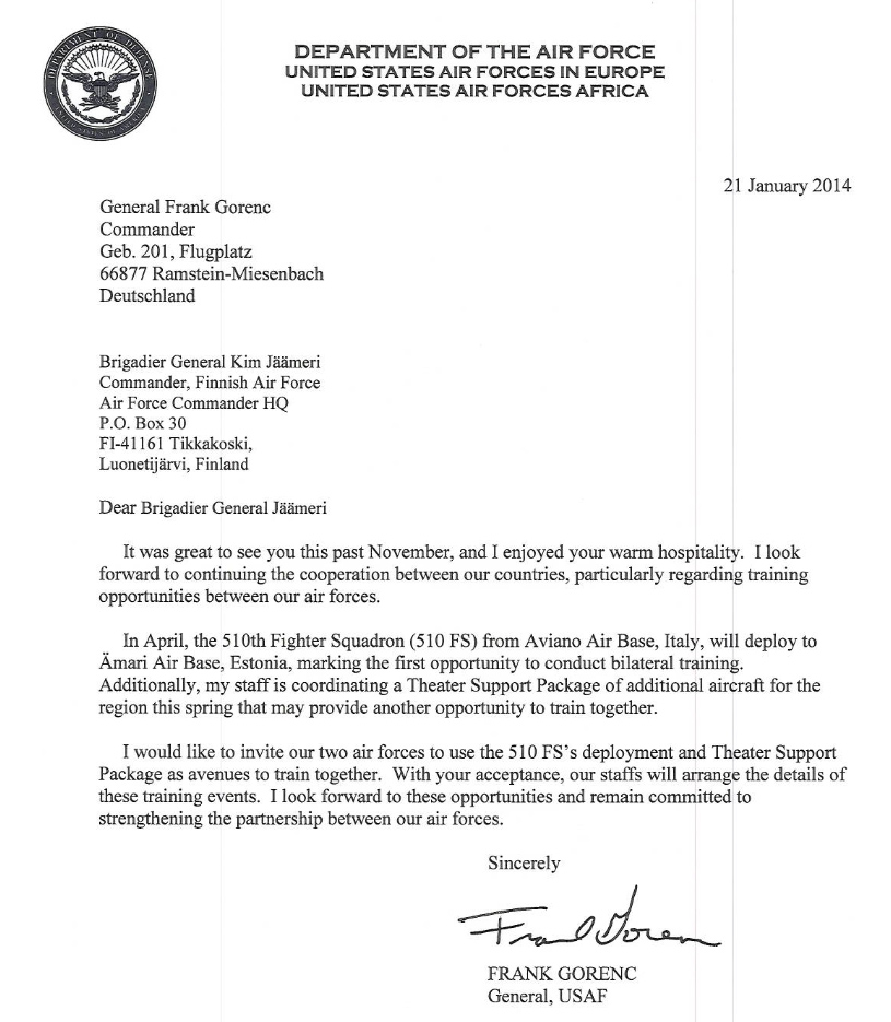 Vasemmalla Puolustusvoimien julkistama, Ilmavoimien komentaja Kim Jäämerelle osoitettu kutsu Ämarissä järjestettävään harjoitukseen. Sen on lähettänyt Yhdysvaltain ilmavoimien Euroopan komentaja, kenraali Frank Gorenc. Kansainväliset harjoitukset parantavat kotimaan puolustuskykyä Osallistuminen kansainväliseen harjoitustoimintaan osoittaa lähiympäristölle Suomen Ilmavoimien olevan suorituskykyinen ja korkeassa valmiudessa. Päämääränä harjoituksissa on uskottavan puolustuskyvyn osoittamisen lisäksi myös yhteensopivuuden kehittäminen.