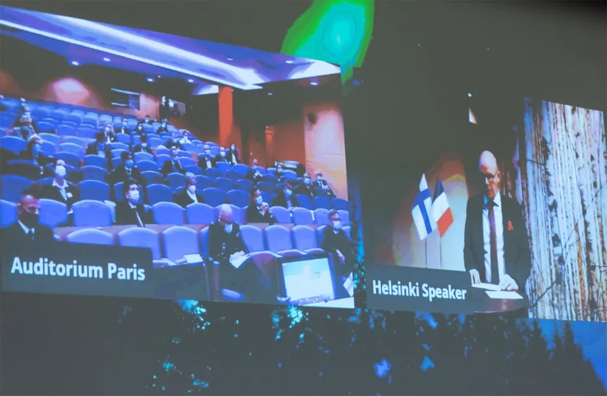 Virtuaaliseminaarin osallistujat puhuivat vuoroin Suomesta Helsingistä PIA ry:n tiloista ja vuoroin Ranskasta Dassaultin pääkonttorilta Saint Cloudista, jossa mukana oli myös Suomen Ranskan suurlähettiläs Teemu Tanner.