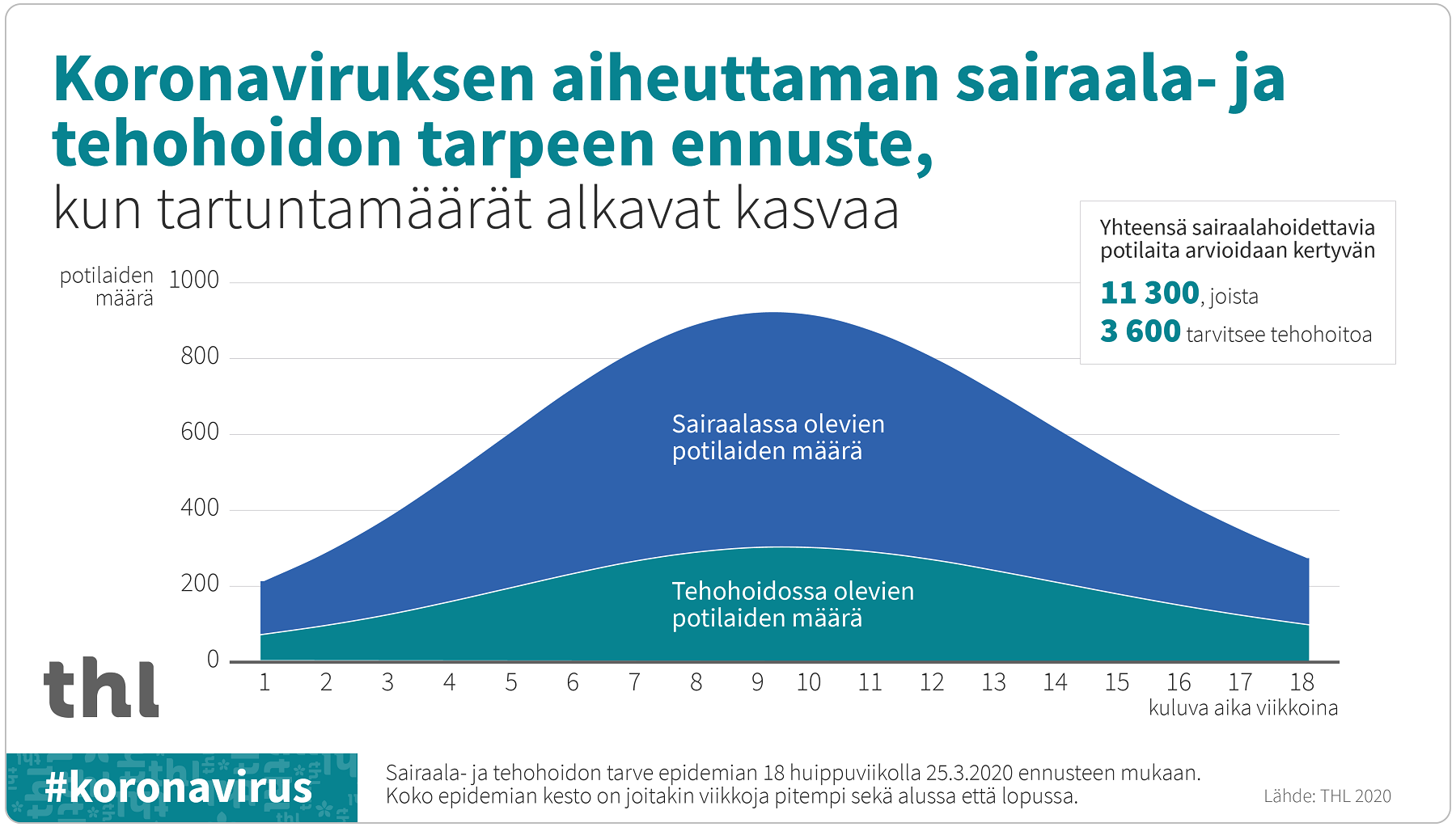 THL:n mukaan 25.3. mennessä tapauksia on todettu yhteensä noin 375 000 maailmanlaajuisesti. Yhteensä 195 maata on raportoinut tartunnoista. Suomessa on todettu 25.3. mennessä yhteensä 880 laboratoriovarmistettua uuden koronaviruksen (COVID-19) aiheuttamaa tautitapausta. Suurin osa Suomessa todetuista COVID-19-tapauksista on ollut lieviä. Sairaalahoitoa vaativia potilaita on tällä hetkellä 82, joista 22 on tehohoidossa. Koronavirusepidemian pituudeksi arvioidaan THL:n mukaan nykyisillä tiedoilla 4-6 kuukautta.